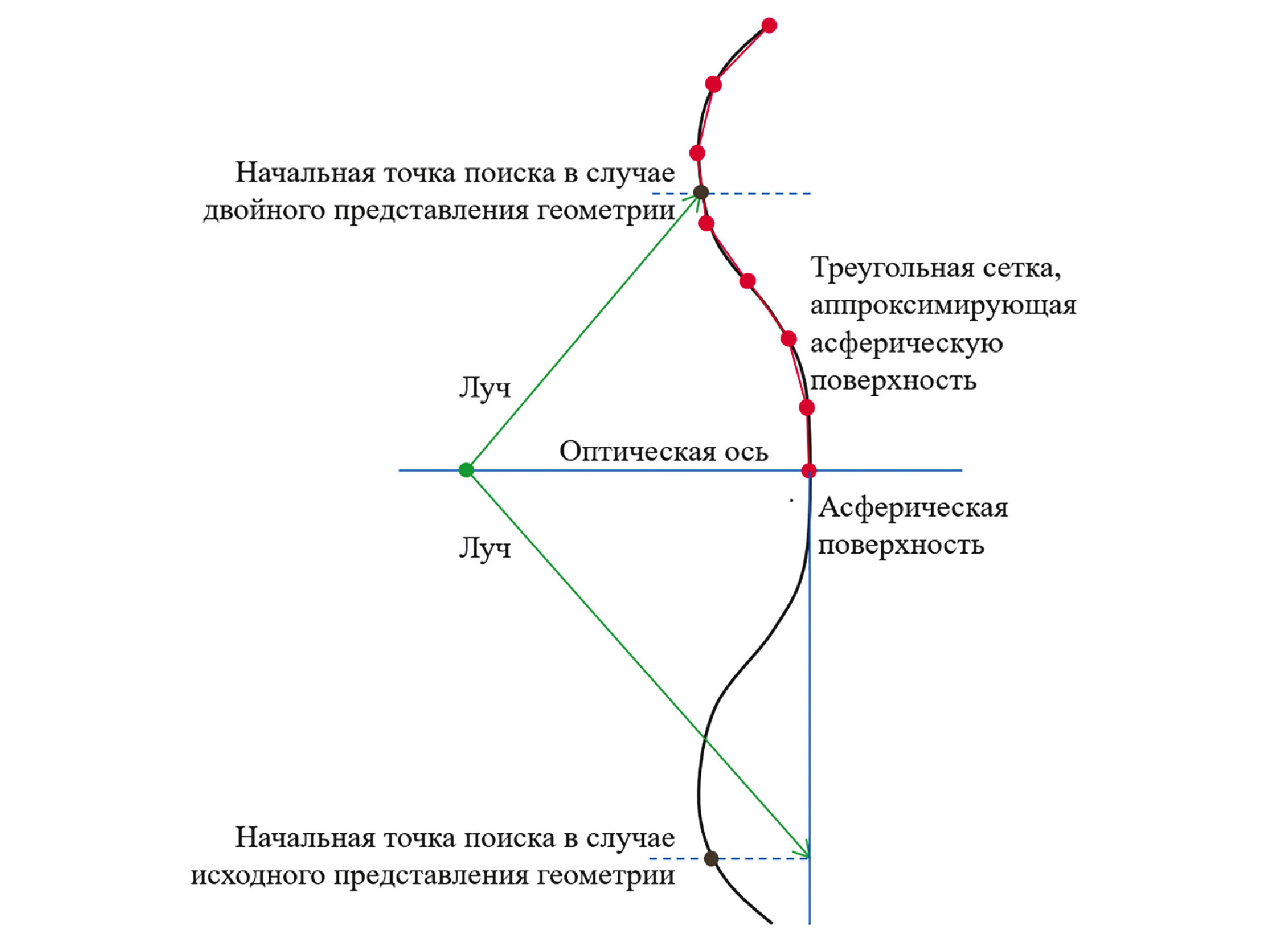 Для повышения точности, стабильности и ускорения вычисления точки встречи луча с поверхностью было реализовано комбинированное решение, заключающееся в двойном представлении геометрии, когда поиск точки встречи луча с поверхностью разбивается на два этапа, сперва происходит быстрый поиск точки встречи луча с грубой треугольной сеткой, от которой далее осуществляется подгонка к асферической поверхности по алгоритмам [4] и [1]. Это решение аналогично алгоритму “displacement mapping” [8], однако цель данного решения не уменьшение объема данных, а повышение стабильности, точности и скорости расчета.