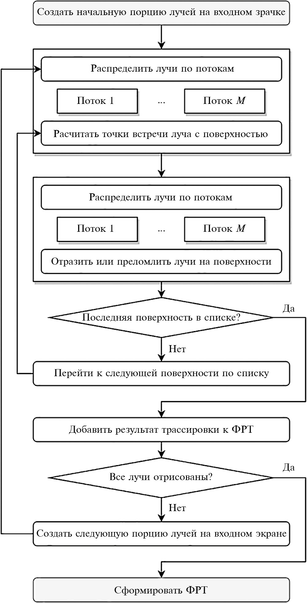 Важным моментом ускорения вычислений является организация вычислений в параллельном режиме. Компания Intel предлагает библиотеку oneTBB для организации параллельных вычислений. Важно, что функции Embree оптимизированы на работу в параллельном режиме с функциями oneTBB, и это позволяет достичь практически стопроцентной загрузки всех ядер процессора при трассировке лучей. Алгоритм расчета ФРТ в параллельном режиме представлен на рис. 8.