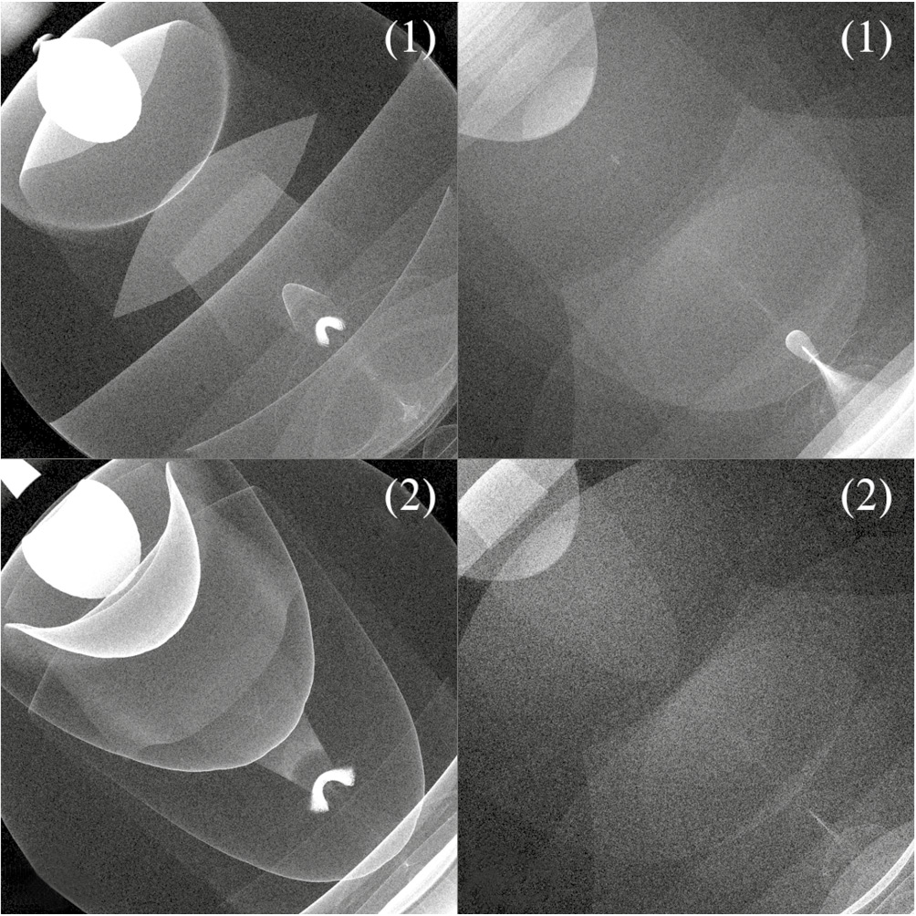 Для двух рассмотренных моделей объективов был произведен расчет бликов, т. е. ФРТ, формирующейся с учетом зеркального переотражения между поверхностями линз. Событие зеркального отражения выбиралось случайным образом в соответствии с коэффициентом отражения, вычисленным по формуле Френеля для границы двух диэлектриков. При выборе события отражения менялся порядок следования поверхностей и луч детерминистически распространялся в обратную сторону. В результате четного числа переотражений формировалась “бликовая” ФРТ. В данном тесте исходные лучи распределялись случайным образом (равномерно) на первой поверхности объектива. Число трассируемых лучей – 1.000.000.000. Поля зрения ω для четырехлинзового объектива составляли 40° и 45° по диагонали, а для пятилинзового объектива поля зрения ω – 48.5° и 50° по диагонали. Размеры изображений составили 2.8 мм для четырехлинзового объектива и 3.6 мм – для пятилинзового объектива. Разрешение изображения составило 500 × 500 точек. Длина волны, на которой выполнялся расчет, – 0.5876 мкм. Время расчета составило 16011 мс для четырехлинзового объектива и 15034 мс – для пятилинзового объектива. Несмотря на небольшой шум изображения, обусловленный недостаточным числом лучей, блики и их характер хорошо видны. Результаты расчета представлены на рис. 10.