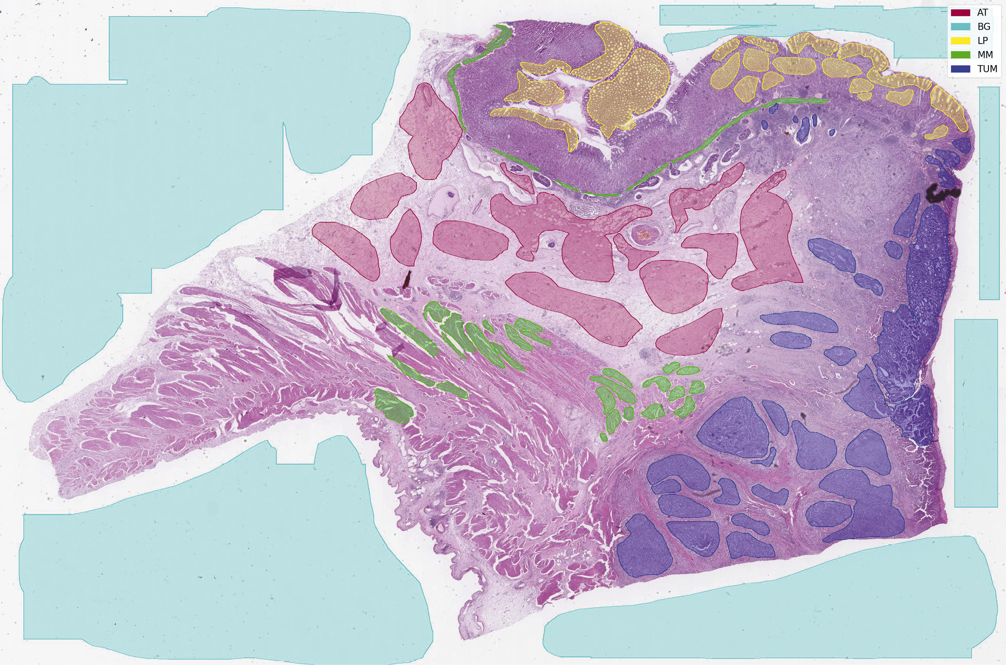 Набор данных PATH-DT-MSU постоянно обновляется и расширяется. В текущей работе впервые представлен поднабор WSS2v2, который предоставляет более подробную и уточненную разметку поднабора WSS1v1, представленного ранее [11]. Используемый набор данных состоит из 10 полнослайдовых изображений препаратов при раке желудка, полученных с оптическим увеличением × 40, разрешение изображений составляет около 110000 × 90000 пикселов. Полигональная разметка имеет 5 классов, включающих в себя классы 4 типов ткани (AT, LP, MM, TUM) и фона (BG). Площадь размеченных областей обучающей выборки составляет 1560, 7098, 533, 895, 1303 млн пикселов для классов AT, BG, LP, MM, TUM соответственно на увеличении ×40. Площадь размеченных областей тестовой выборки составляет 1086, 8032, 318, 743, 1199 млн пикселов для классов AT, BG, LP, MM, TUM соответственно на увеличении ×40. Пример полнослайдового изображения с визуализацией разметки из набора PATH-DT-MSU WSS2v2 приведен на рис. 1.