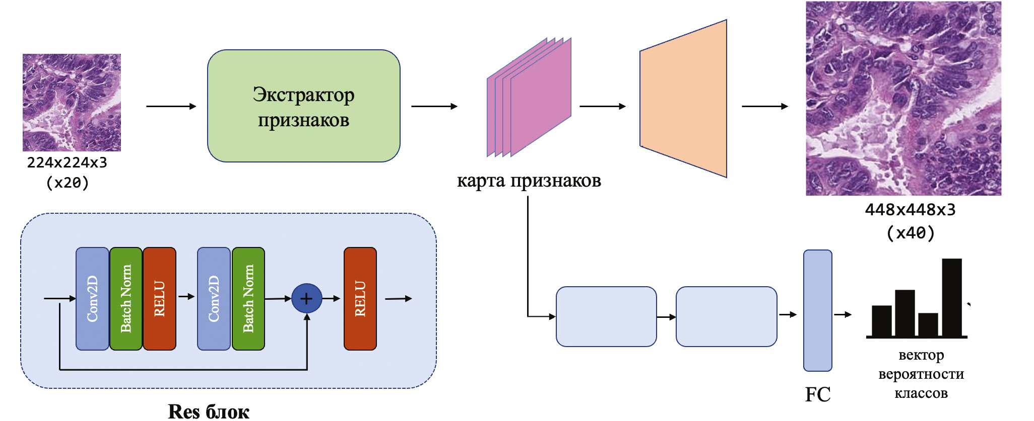 Необходимо построить и обучить нейросетевую модель, работающую с фрагментами полнослайдовых гистологических изображений, имеющую один вход (патч 224 × 224 × 3 на увеличении ×20) и два выхода (изображение 448 ×448 ×3 на увеличении ×40 и вектор вероятностей длины N, соответствующий N типам ткани). Первый выход соответствует увеличенному в 2 раза входному патчу, второй выход – предсказанию типа ткани входного патча. Таким образом, эта нейросетевая модель должна одновременно решать задачи повышения разрешения и классификации фрагментов полнослайдовых изображений.