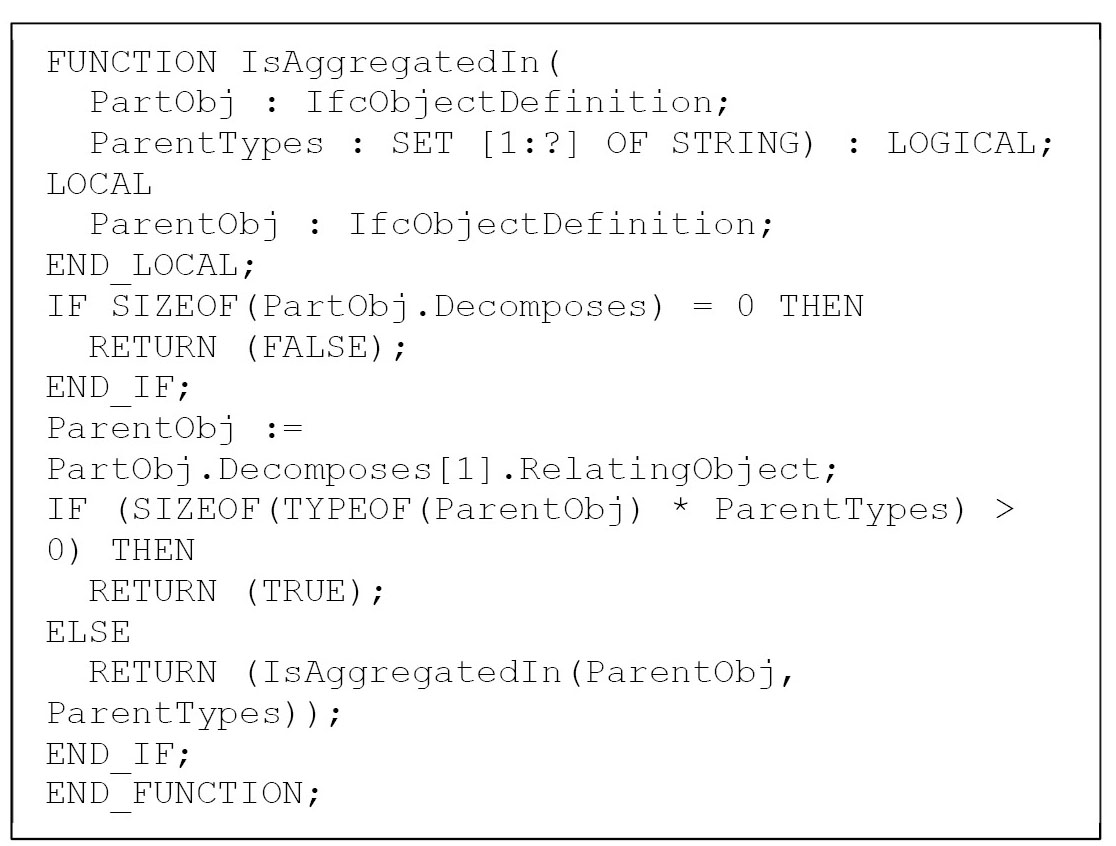 Для отношений другого вида можно написать аналогичные функции на языке EXPRESS, которые в статье не приводятся для краткости изложения. Также существует функция PartOf, которая в зависимости от типа передаваемого объекта и списка типов отношений вызывает упомянутые вспомогательные функции для проверки его вхождения в те отношения, которые задаются входным параметром и являются допустимыми для его типа согласно спецификации IFC.