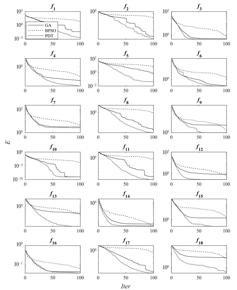 В результате выполнения эксперимента были получены значения критериев эффективности каждого алгоритма. Данные значения приведены в табл. 4. Последняя строка таблицы содержит средние значения показателей. На рис. 5 показаны графики сходимости алгоритмов, позволяющие оценить скорость сходимости. Графики представлены в логарифмической шкале по оси критерия сходимости, что позволяет более четко отследить скорость сходимости алгоритмов на протяжении всей их работы.