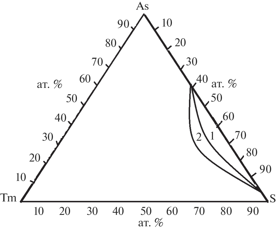 Based on the data obtained by complex methods of physicochemical analysis on studying various sections of ternary Tm–As–S(Se) systems and using the published data, the boundary of the glass formation region of the Tm–As–S and Tm–As–Se system is determined. It is established that at a cooling rate of 10 deg/min in the Tm–As–S system, the glass formation area of the system’s glass is 33 at % of the total area of the triangle; and at a cooling rate of 102 deg/min, 51 at % of the total area of the triangle. In the Tm–As–Se system under the specified cooling regimes, the glass area is 35 and 54 at %, respectively.