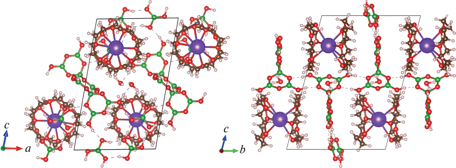 Crystals of a novel hybrid organo-inorganic borate, K[B5O6(OH)4][B(OH)3]2(H2O)(C10H20O5)2 (1), were obtained from aqueous solutions and characterized by single-crystal X-ray diffraction and IR spectroscopy. 1 is triclinic (a = 10.1567(4), b = 11.9941(6), c = 17.1893(9) Å, α = 75.280(4), β = 79.406(4), γ = 88.531(4)°, V = 1990.270369 Å3, SG P-1; R1 = 0.058). Its structure contains [K(C10H20O5)2]+ groups which behave as “hydrophobic” templates for the inorganic part comprised of B5O6(OH)4 anions and neutral B(OH)3 molecules.