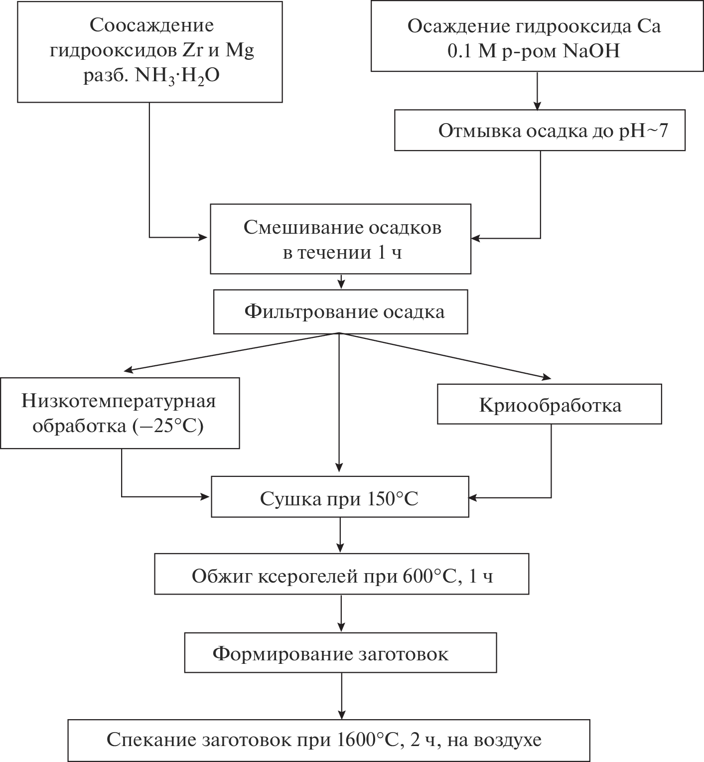 By using the method of coprecipitation of hydroxides in the ZrO2–CaO–MgO system, xerogels, powders, and ceramics based on them are obtained. The effect of low temperatures during the preparation of precursors on the phase composition and physicochemical properties of the materials is studied. It is shown that the use of precipitate’s cryotreatment makes it possible to reduce the open porosity and water absorption of the ceramics.
