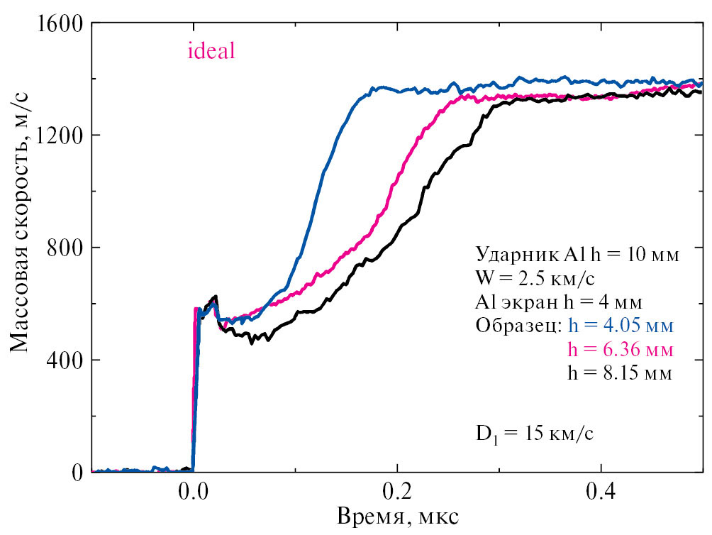 На рис. 2 приведены профили массовой скорости для трех толщин образца и видно, что вторая волна не является ударной, ее фронт расширяется по мере распространения по образцу. Это означает, что в исследуемом интервале давлений «Идеал» обладает аномальной сжимаемостью и говорить о скорости распространения второй волны некорректно. Аналогичная структура импульса сжатия, обусловленная аномальной сжимаемостью, наблюдалась авторами [16] в Si C. Следует отметить, что в приведенных координатах t/h все три профиля скорости, представленные на рис. 2, практически совпадают. Это означает, что вторая волна является центрированной волной сжатия, что позволяет рассчитать амплитуду давления в импульсе, которая оказывается равной 34 ГПа.