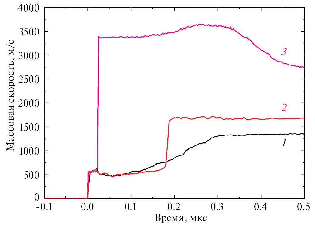 Рис. 2. Профили массовой скорости на границе образец — вода при фиксированных условиях нагружения и различной толщине образцов.
