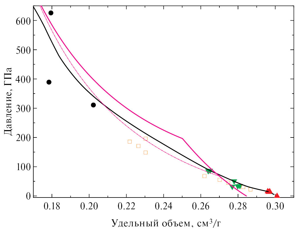 Полученная ударная адиабата «Идеала» в координатах давление — удельный объем приведена на рис. 5. Здесь красными треугольниками обозначены экспериментальные данные по определению упругой части ударной адиабаты. Зеленые треугольники — область пластической волны в «Идеале». Черные кружки — сжимаемость «Идеала», полученная в экспериментах на маховском взрывном кумулятивном генераторе. Экспериментальные данные из работы [23] по ударной сжимаемости композита на основе смеси частиц алмаза и карбида кремния микронного размера обозначены красными квадратиками. Сплошная черная кривая — интерполяция наших экспериментальных данных. Розовая сплошная кривая — интерполяция экспериментальных данных [17] по наноалмазу. Розовый пунктир — интерполяция экспериментальных данных [14] по кристаллическому алмазу.