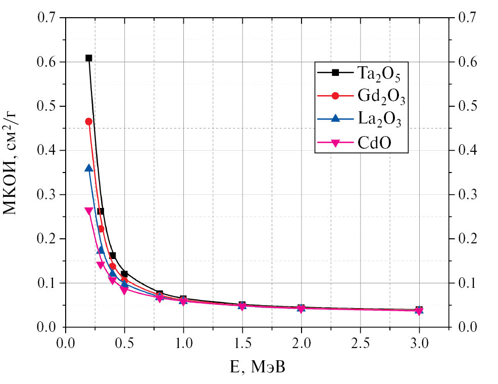 Рис. 4. Зависимость МКОИ Ta2O5, Gd2O3, La2O3 и CdO от энергии квантов ВФИИ (по данным настоящей работы).