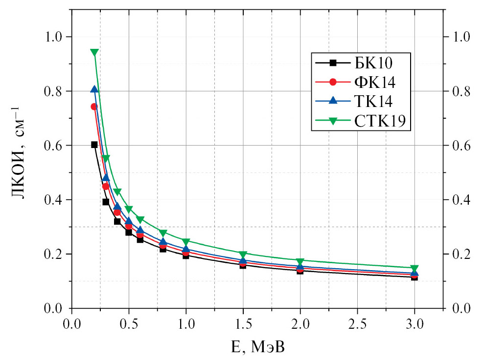 Состав стекла ЛК3 — самый простой, он представлен оксидами SiO2, B2O3, K2O и легким фтором [здесь и далее 16]. В стекле К8, кроме этих оксидов и оксида натрия, имеется 2.65 мас.% ВаО, поэтому в области энергий до 1.0 МэВ его ЛКОИ увеличивается быстрее при движении в сторону меньших энергий, чем ЛКОИ стекла ЛК3. В стекле К19 концентрация ВаО уже равна 5.57, а у стекла БК8–20.02 мас.%. Столь заметное увеличение концентрации ВаО в сравниваемых стеклах при переходе от К8 к К19 и БК8 как раз и вызывает более стремительный рост ЛКОИ стекол по мере уменьшения энергии квантов ВФИИ.