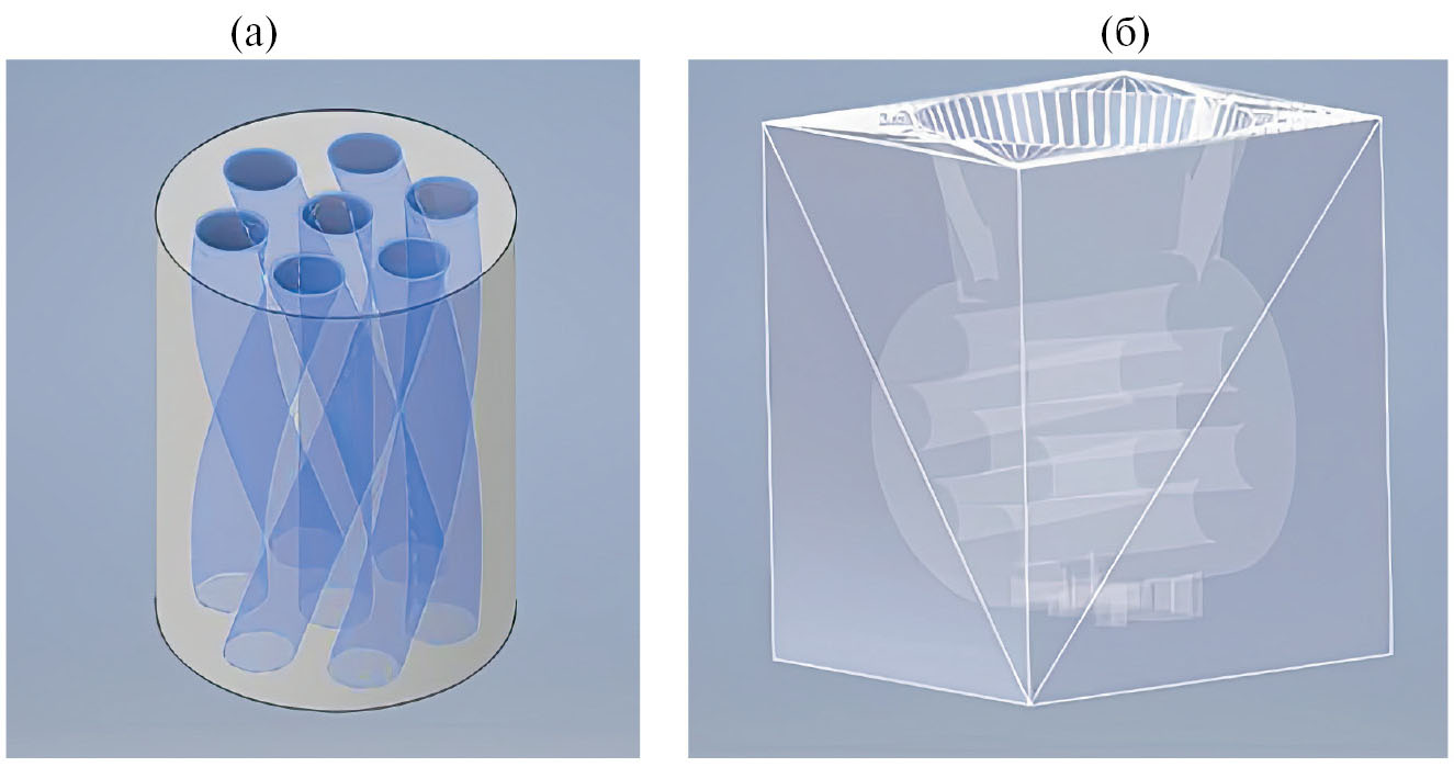 Рис. 1. Моделирование первичного носителя блочного катализатора: а) модель первичного носителя блочного катализатора, б) модель формы для литья первичного носителя блочного катализатора.