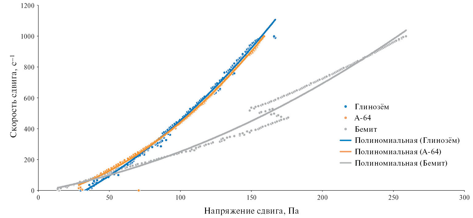 На рис. 2 представлена зависимость скорости сдвига от напряжения сдвига для шликеров с «ГРТ», «А-64» и «бемит». У шликеров с ГРТ/А-64/ бемитом разные начальные эффективные вязкости η0 = 29.9/40.6/14.6 Па•с соответственно. При этом известно, что начальная эффективная вязкость зависит, прежде всего, от введенного количества воско-парафиновой смеси, а также от размера частиц оксидного или гидроксидного порошка.