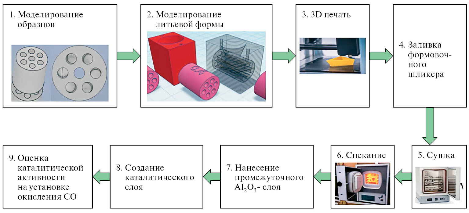 Процесс получения блочных катализаторов на основе первичных носителей, сформированных методом 3D-печати, представлен постадийной схемой на рис. 3.