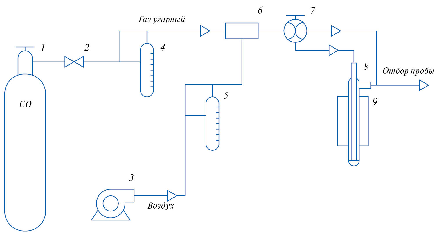Рис. 4. Схема установки для определения каталитической активности образцов в реакции окисления СО кислородом воздуха: 1 — баллон с СО; 2 — кран тонкой регулировки; 3 — микрокомпрессор; 4 — реометр; 5 — ротаметр; 6 — смеситель; 7 — четырехходовой (лунный) кран; 8 — металлический трубчатый реактор; 9 — трубчатая печь.