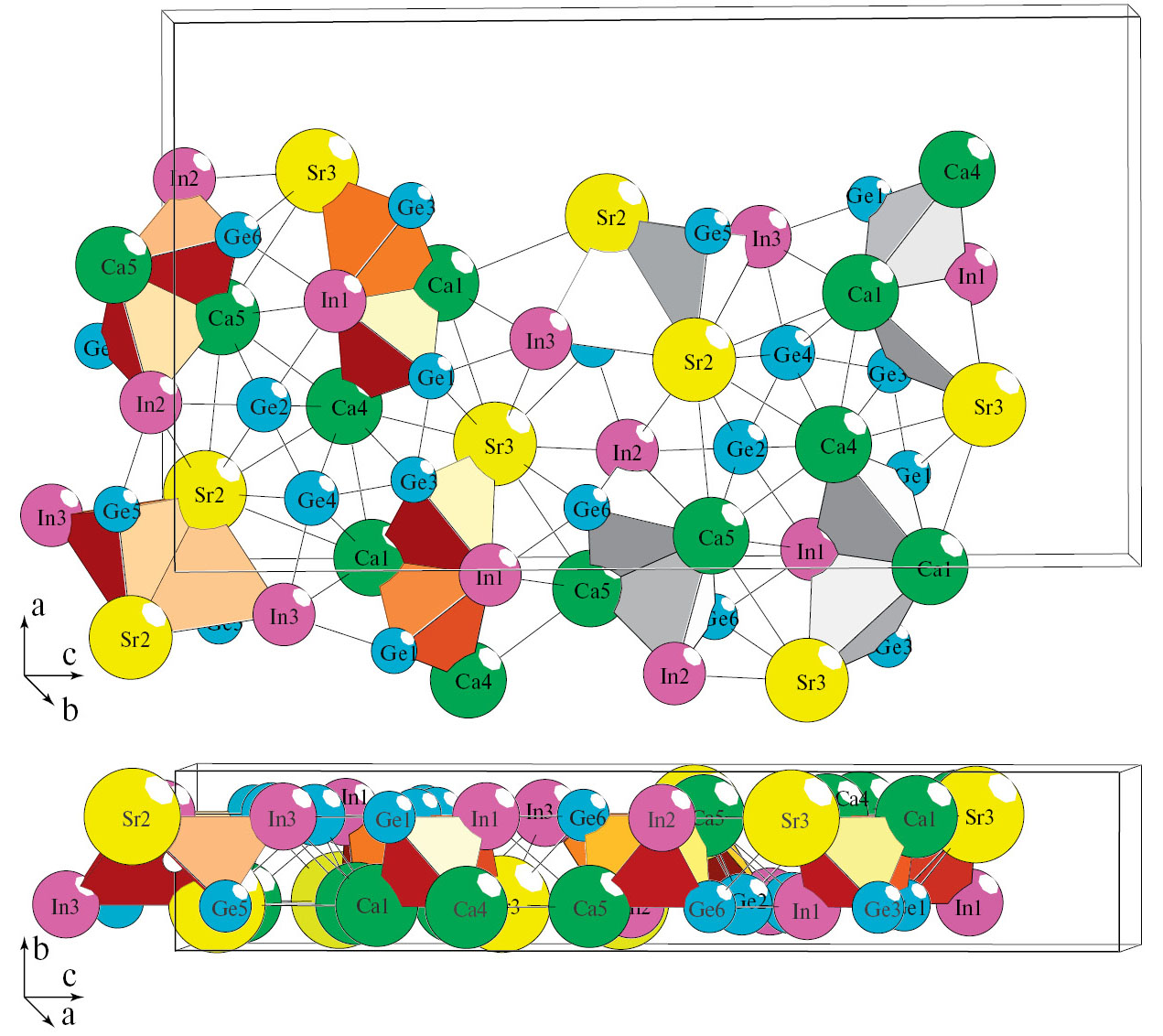 Кристаллическая структура Sr2Ca4In3Ge6-oP56 входит в кристаллохимическое семейство A2B3In3Ge6 (A = Sr, Eu, B = Ca, Yb) [12]. Параметры ромбической ячейки: a = 13.2438 Å, b = 4.4603 Å, c = 23.5050 Å, V = 1388.47 Å3. В элементарной ячейке находится 56 атомов. Последовательность Вайкоффа для 14 кристаллографически независимых атомов имеет вид c14. Значения координационных чисел для атомов Sr = 16 и 13 атомов; атомов Ca — 12 (2 атома), 15 (5 атомов), 17 (1 атом); атомов In — 12 (2 атома) и 10; атомов Ge — 9 (5 атомов) и 8 (1 атом). Тип каркас-образующих кластеров-прекурсоров интерметаллидов неизвестен.
