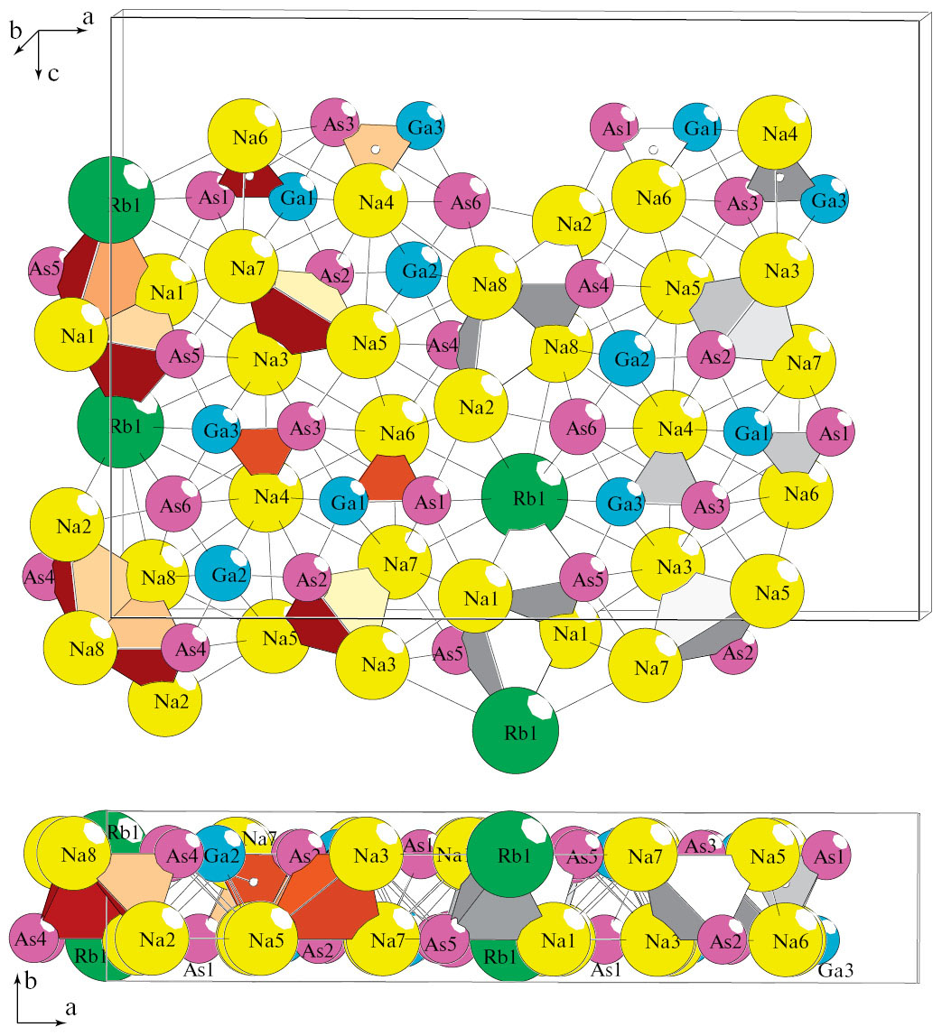 Рис. 6. RbNa8Ga3As6-oP72. Слой кристаллической структуры S32 (две проекции)