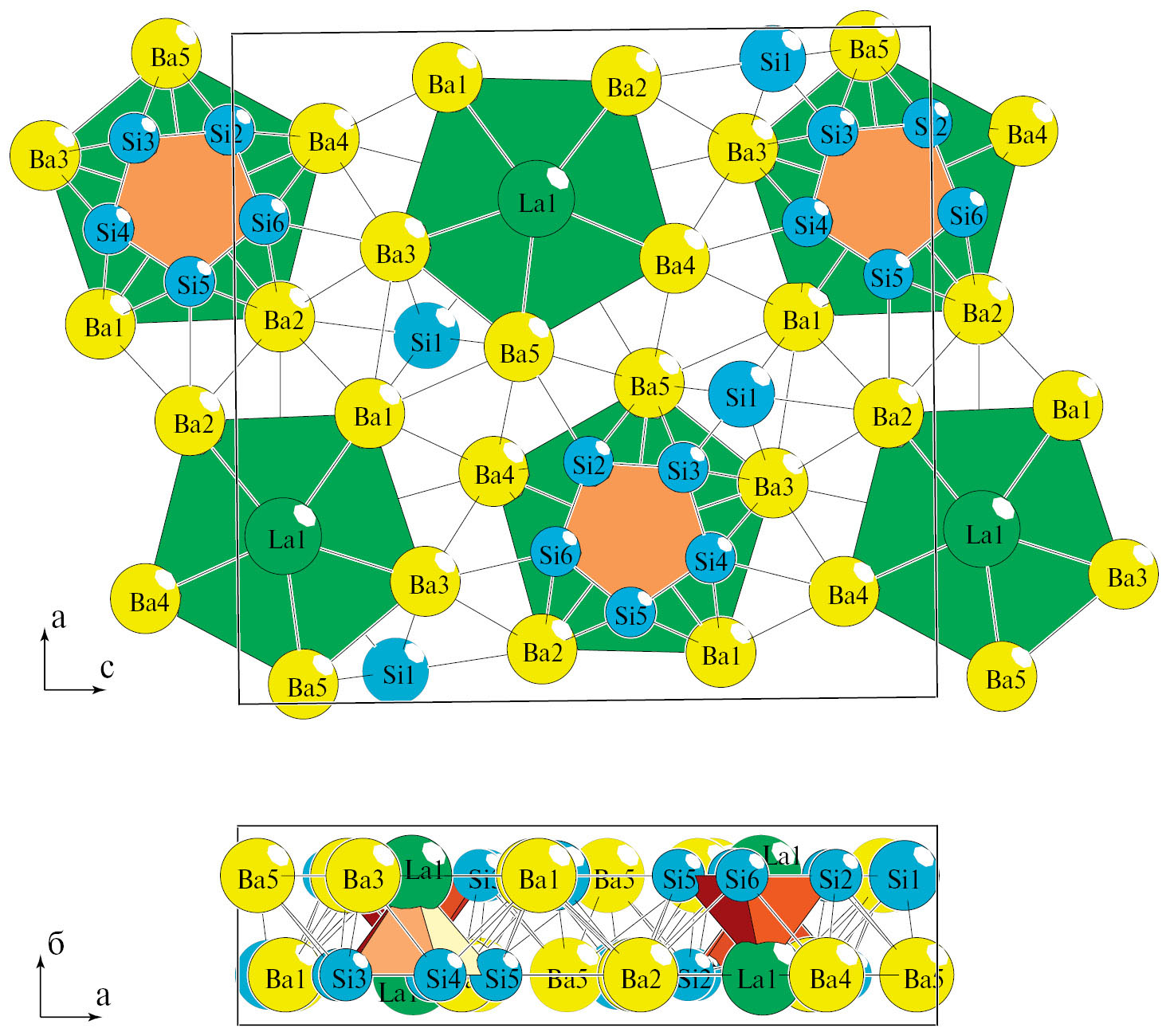 Рис. 1. Кристаллическая структура Ba10La2Si12-oP48. Две проекции