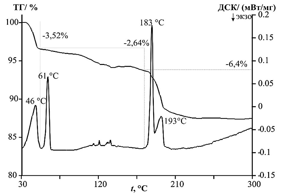 Данные термического анализа. На кривой ТГ наблюдается трехступенчатая потеря массы: при 33÷54°C масса уменьшается на 3.5 мас.%, при 54÷168°C на 2.6 мас.%, при 168÷300°C на 6.4 мас.%. Потери массы, в сумме составляющие 12.6 мас.%, связаны с дегидратацией, следовательно, происходит полная дегидратация. На кривой ДСК отмечается четыре интенсивных эндотермических эффекта. При 46°C происходит частичная дегидратация NaHSO4·H2O с образованием смеси фаз: 0.7∙NaHSO4∙H2O : 0.3∙NaHSO4, а при температуре 61°C происходит поверхностное плавление оставшегося NaHSO4·H2O. При 174°C эта фаза снова начинает дегидратироваться, и на фоне этого процесса при 183°C происходит подплавление NaHSO4. При температуре 193°C образец полностью дегидратирует и содержание фазы NaHSO4 достигает ~100%.