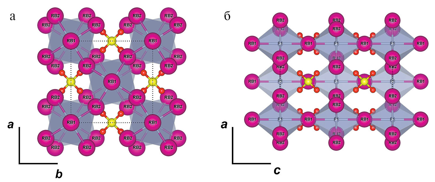 Рис. 1. Кристаллическая структура Rb3SO4F в проекции на плоскость (001) (a) и (010) (б). Обозначения на рисунке: атомы рубидия окрашены в розовый цвет, атомы серы — в желтый, атомы кислорода — в красный