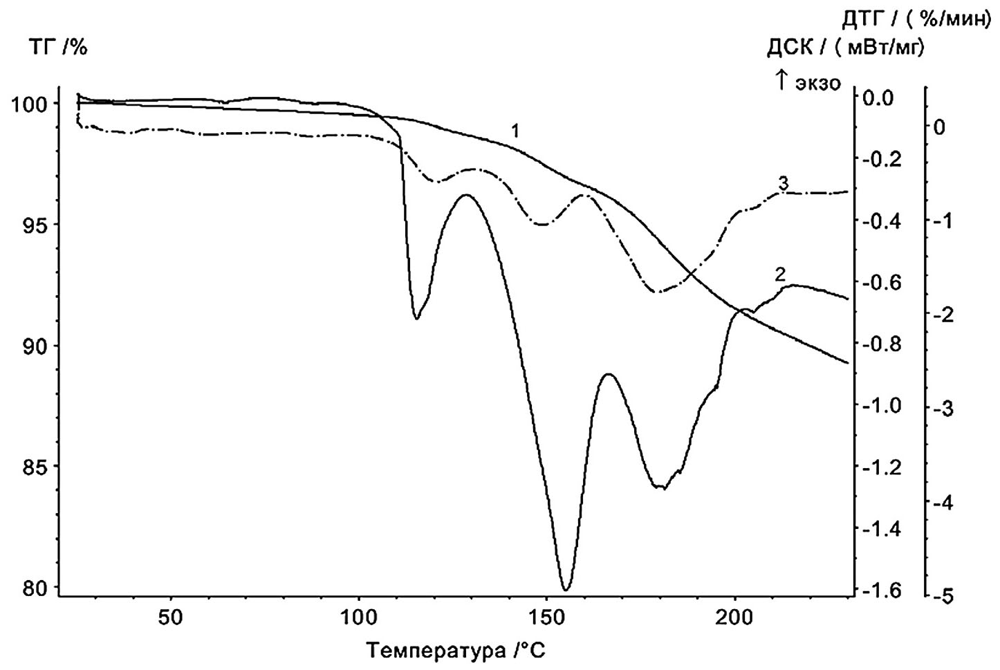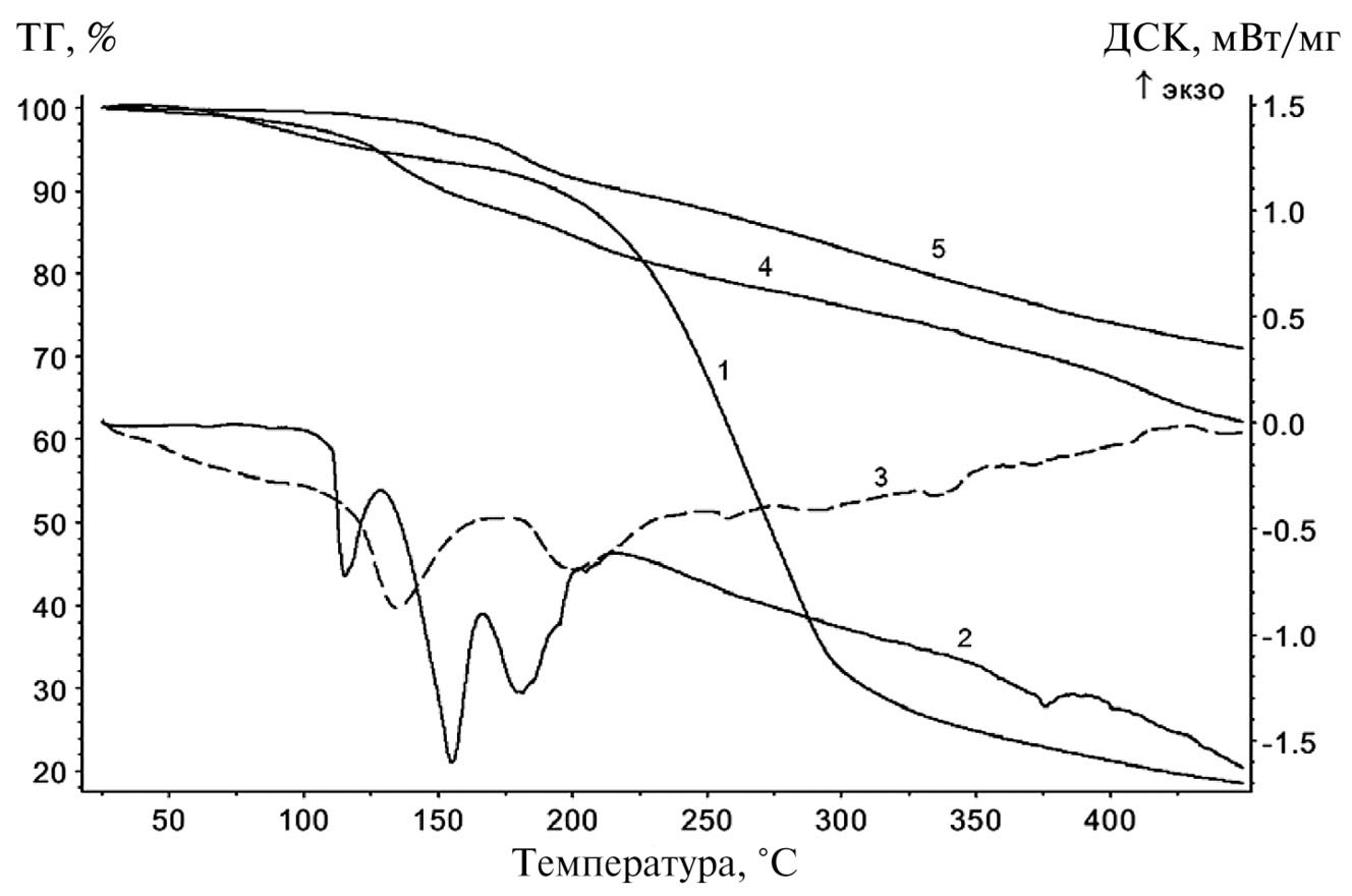Проведен термический анализ исходных соединений, определивший диапазон температур, при которых отсутствуют термические превращения компонентов смесей, Т ≤ 110°C, а наблюдаемые изменения могут быть объяснены лишь их взаимодействием. Показано, что при более высоких температурах наблюдаются эндотермические процессы с существенно различающимися температурными максимумами (рис. 1).
