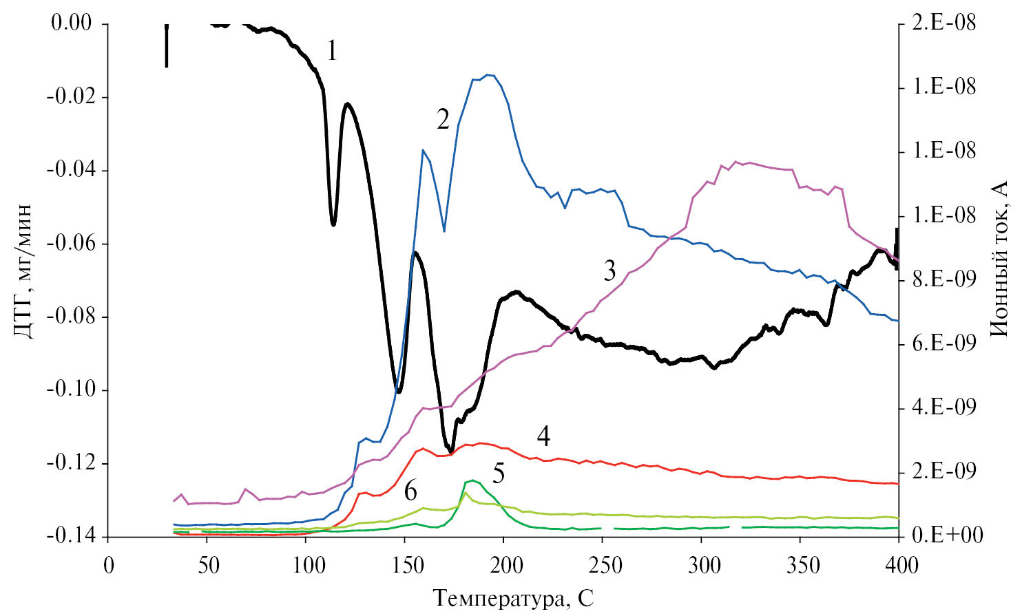 Рис. 2. Дифференциальная кривая падения массы ПФА (1) и интенсивность тока при значениях массы ионов, соответствующих: NH3 (2), Н2О (3), NO (4), CO2 (5), CO (6)