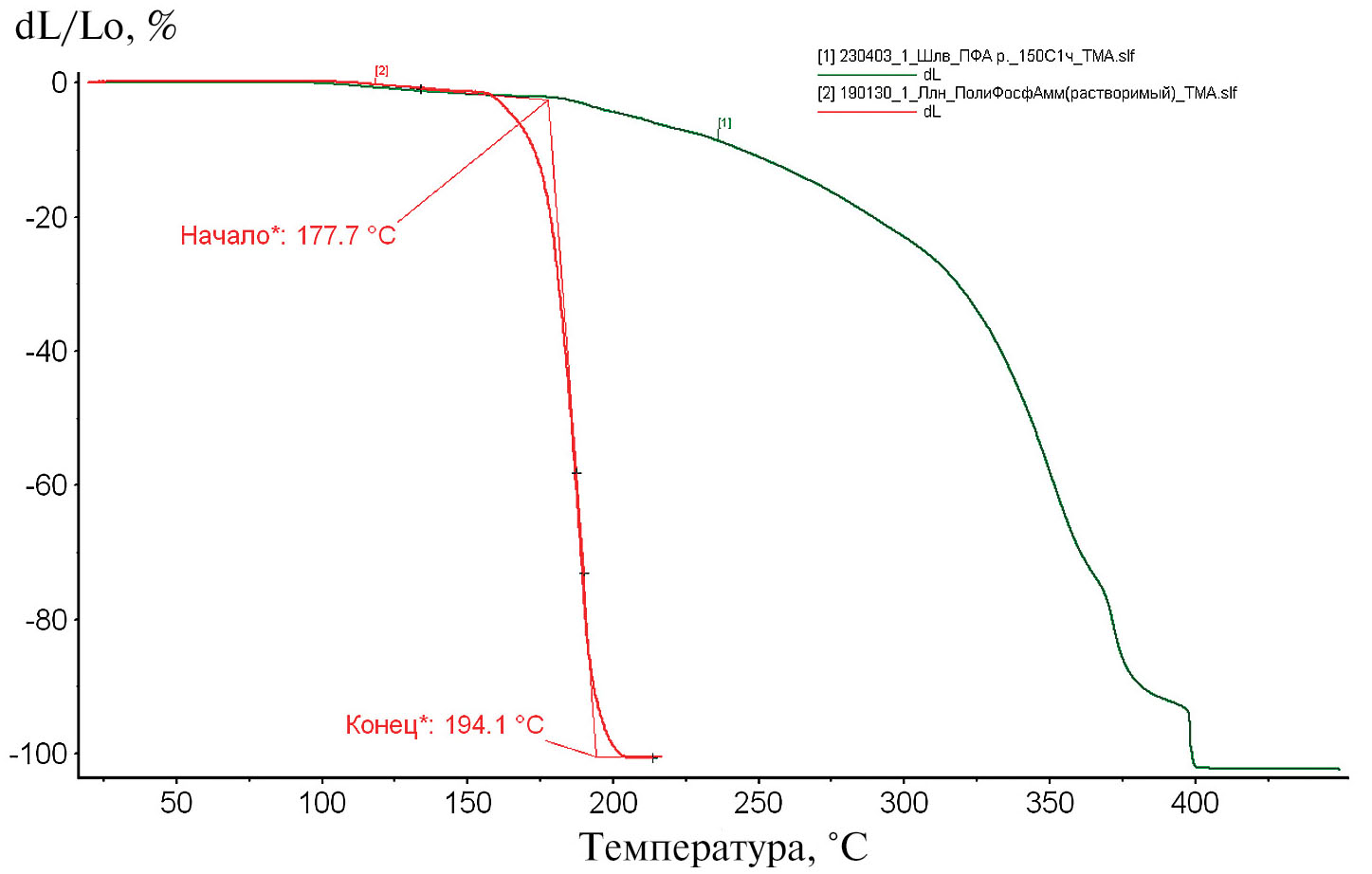 Рис. 3. Термомеханические кривые, полученные до и после термообработки ПФА при 150°С, 1 ч