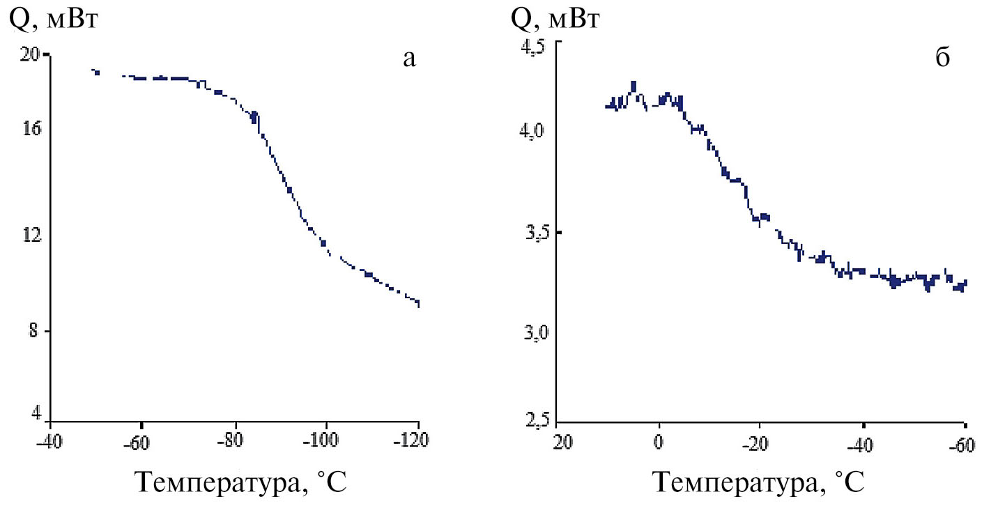 Кроме того, в полученных образцах обнаружены фракции с низкими температурами стеклования (рис. 6, а, б), значения которых определяются температурой синтеза (табл. 2).