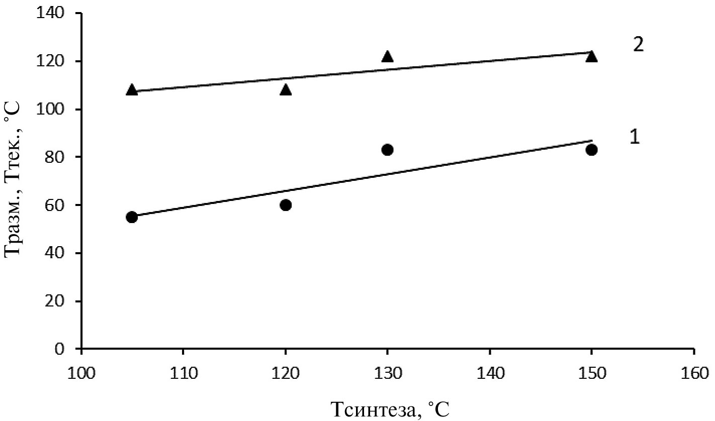 Условия синтеза оказывают влияние не только на температуру стеклования аморфной фазы, но и на температуру размягчения и текучести высокотемпературной фракции (рис. 7).