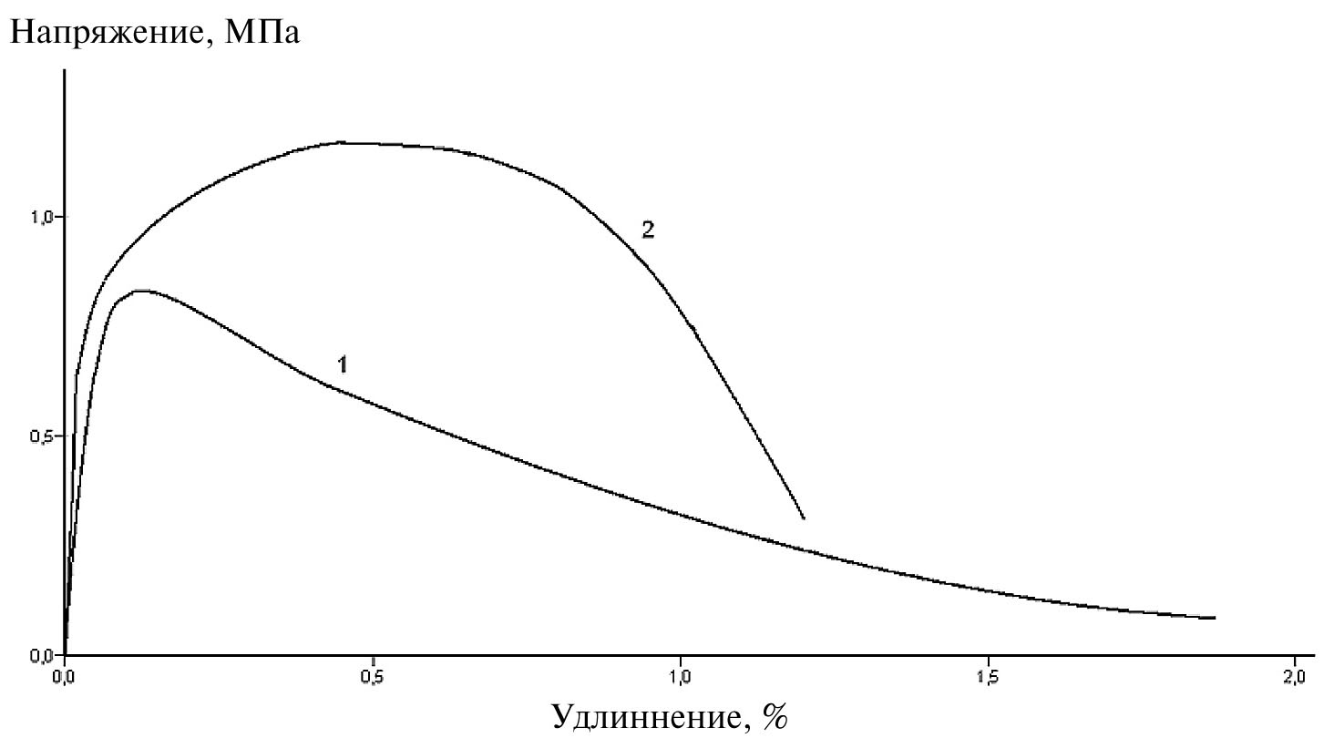Рис. 9. Диаграмма растяжения композиции ПФА/0.3 мас. ПЭПА (120°С, 1 ч) при различных скоростях деформирования: 1–1 мм/мин, 2–10 мм/мин