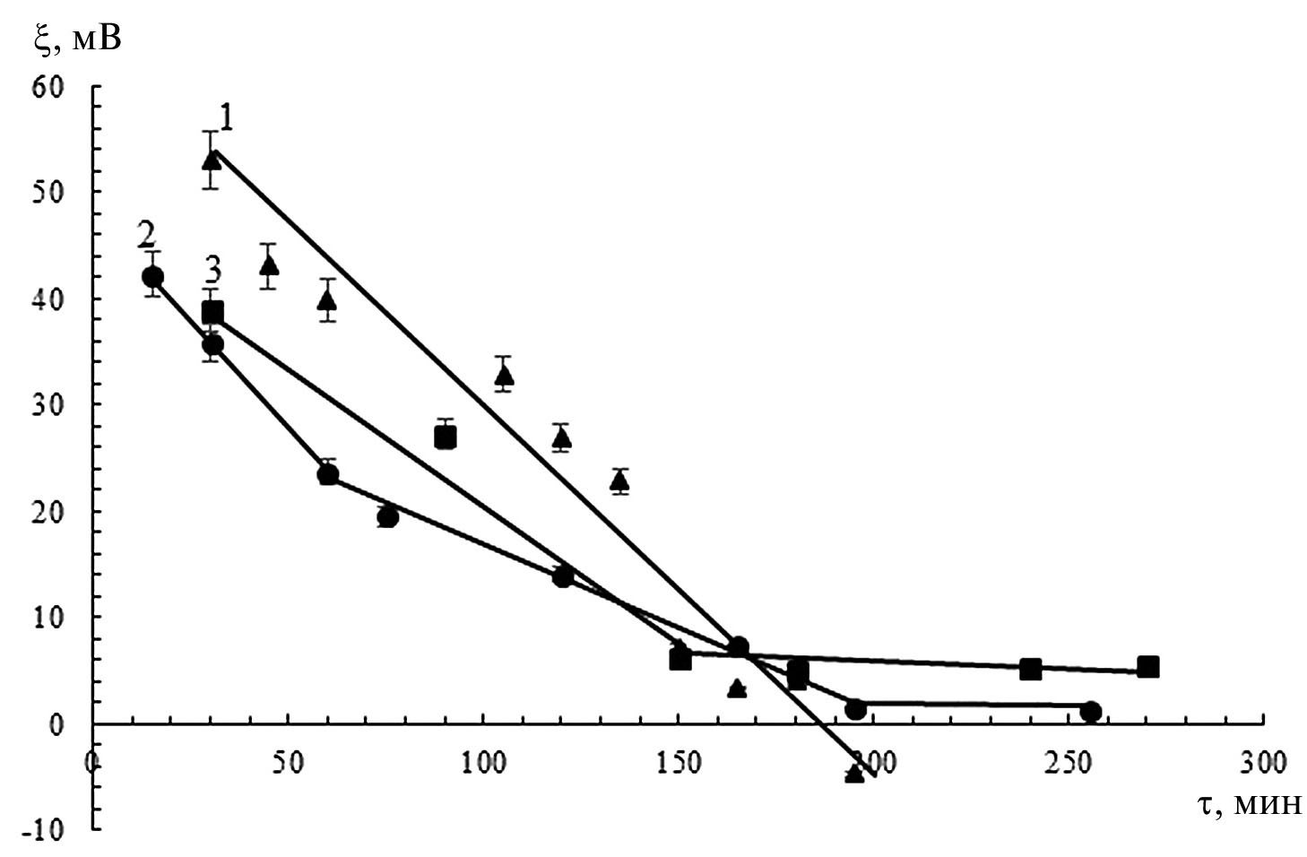 Рис. 2. Изменение ξ-потенциала во времени прекурсоров исследуемых оксидных систем; номер кривой соответствует номеру образца в табл. 1