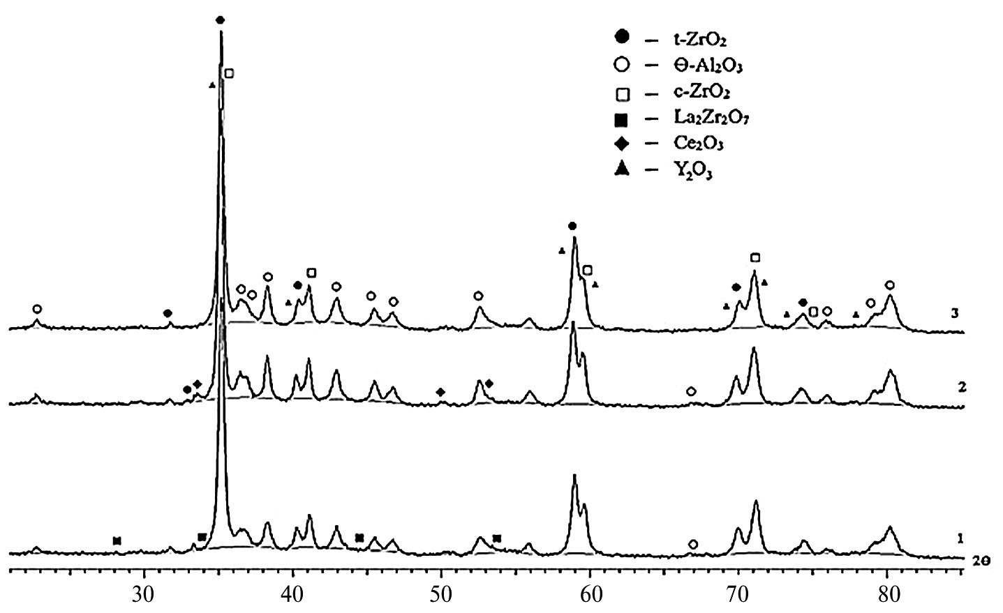 При дальнейшем повышении температуры вплоть до 1100°С формируются оксиды θ-Al2O3, c-ZrO2 с сохранением некоторого количества t-ZrO2, оксиды церия (III) Ce2O3 и иттрия(III) Y2O3, а также сложный оксид лантана (III) La2Zr2O7 (рис. 4, табл. 5).