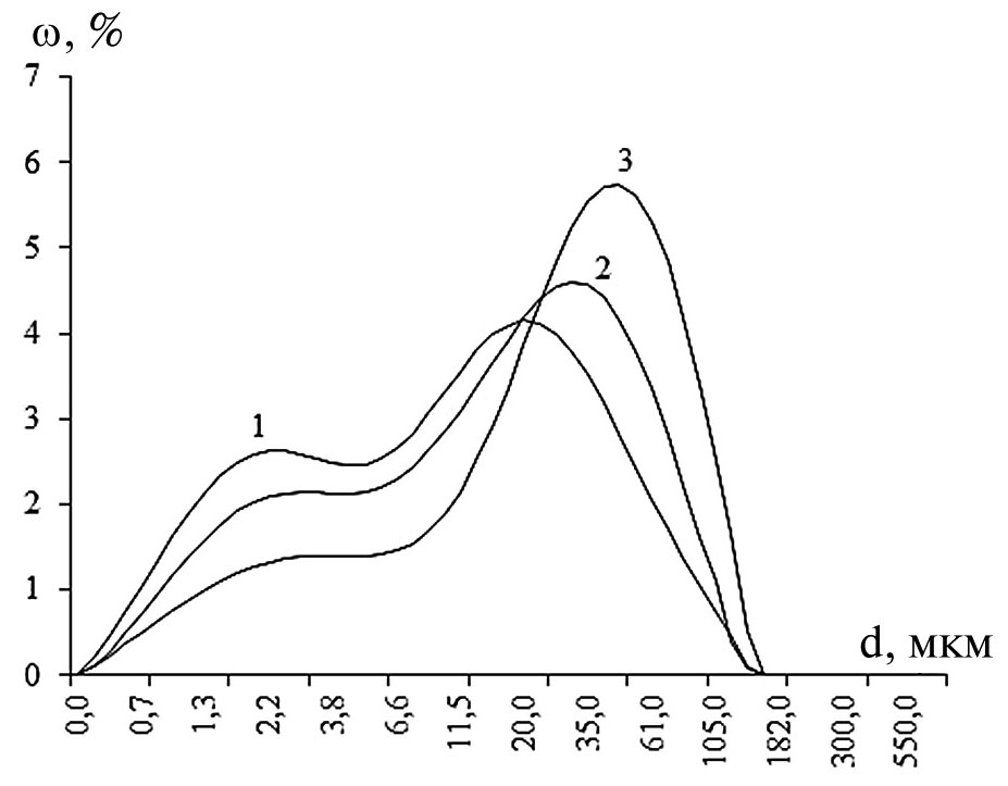 Рис. 5. Распределение частиц по размерам для образца № 3 (система Al2O3-ZrO2-La2O3), термообработанного при °С: 1–80, 2–550, 3–1100