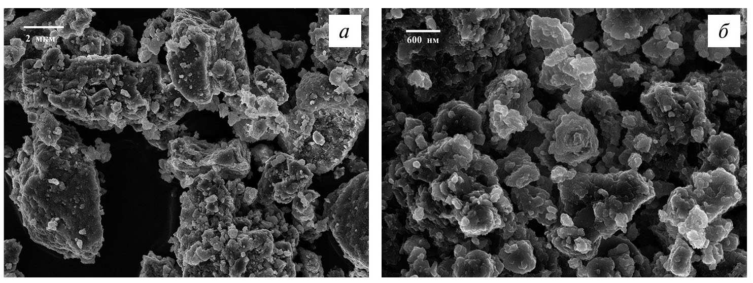 Детальное исследование сформированных дисперсных систем с помощью сканирующей электронной микроскопии демонстрирует сложную структуру агрегатов частиц, состоящих из более мелких наноразмерных образований неправильной формы. На приведенном изображении фрагмента поверхности частиц (рис. 6) размер агрегатов лежит в пределах 2–6 мкм, а размер базовых частиц составляет 120–400 нм.