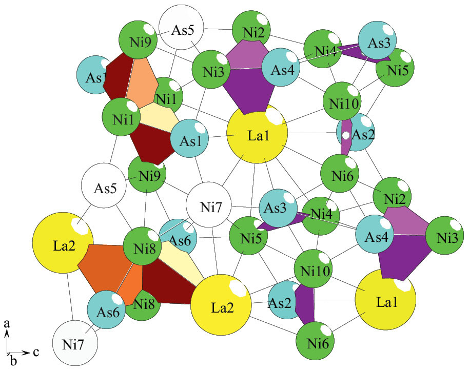 Тройное соединение La8Ni40As24–oP72 не имеет кристаллохимических аналогов. Параметры ромбической ячейки: a = 11.179 Å, b = 3.913 Å, c = 24.443 Å, V= 1069.3 Å3. Набор элементов точечной симметрии для пространственной группы Pnma: –1(4a, 4b), m(4c). Последовательность Вайкоффа для 18 кристаллографически независимых атомов имеет вид c18. Рассчитанные значения координационных чисел атомов La = 19 (1 атом) и 17 (1 атом), Ni = 12 (9 атомов), 13 (1 атом), As = 9 (5 атомов) и 1(1 атом). Тип каркас-образующих кластеров-прекурсоров, образующих упаковки не известен.