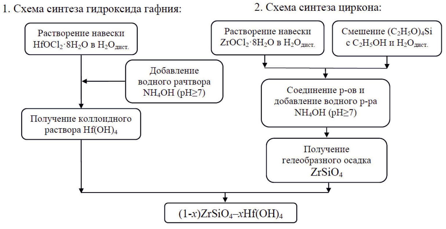 Для получения порошков-прекурсоров (1-х)ZrSiO4–хHf(OH)4, где х = 0.0, 0.5, 0.7, 0.8 и 1.0, была применена оригинальная золь-гель методика, разработанная ранее для получения порошков-прекурсоров (1–х)ZrSiO4–хZrO(OH)2, и основанная на раздельном получении коллоидных растворов компонентов и затем их сливания для образования гелей-прекурсоров и их вызревания [7]. Схема синтеза представлена на рис. 1.