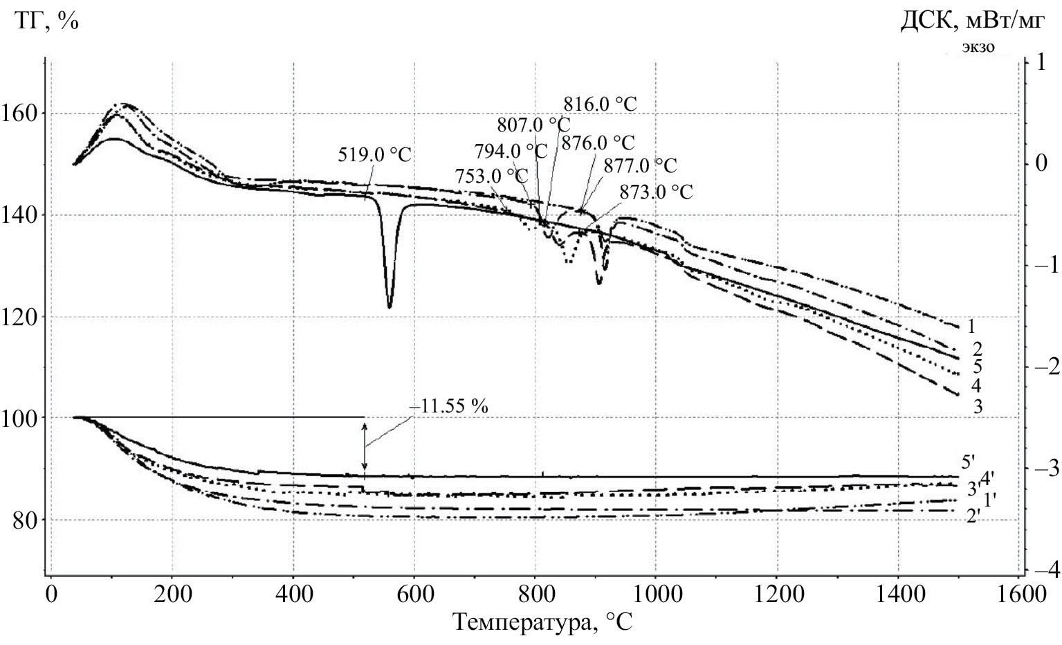 Рис. 3. ДСК кривые порошков-прекурсоров (1–х) ZrSiO4–хHf(OH)4, где х = 0.0 (кривая 1, штрих-2-х пунктирная), 0.5 (кривая 2, штрих-пунктирная), 0.7 (кривая 3, штриховая), 0.8 (кривая 4, пунктирная) и 1.0 (кривая 5, сплошная); а также соответствующие кривые ТГ (1', 2', 3', 4' и 5')