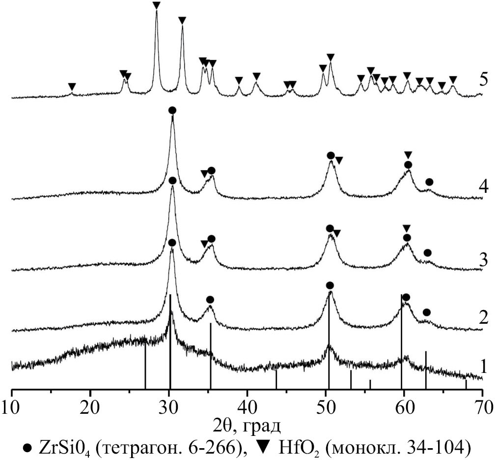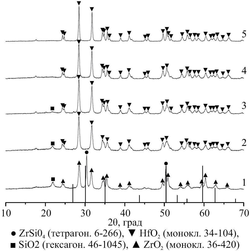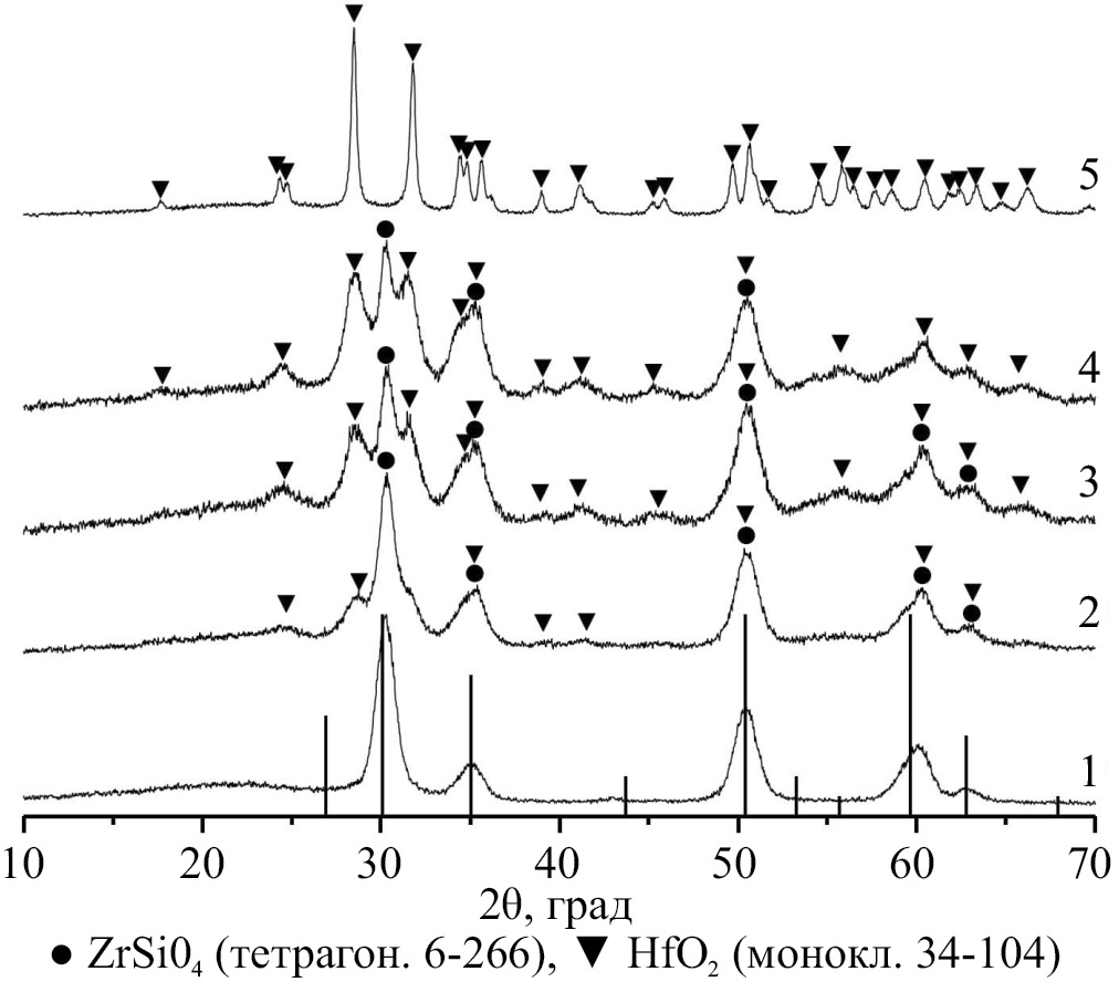 Рентгеновские дифрактограммы, представленные на рис. 4, подтверждают образование соответствующих композиций (1–x)ZrSiO4–xHfO2, при этом заметно стимулирующее влияние оксида гафния, как и в случае оксида циркония [7], на кристаллизацию циркона в смеси компонентов – рефлексы, отвечающие циркону, становятся более узкими и интенсивными (рис. 4, дифрактограммы 2–4). Это подтверждается и снижением температуры начала кристаллизации циркона в композициях (рис. 3).
