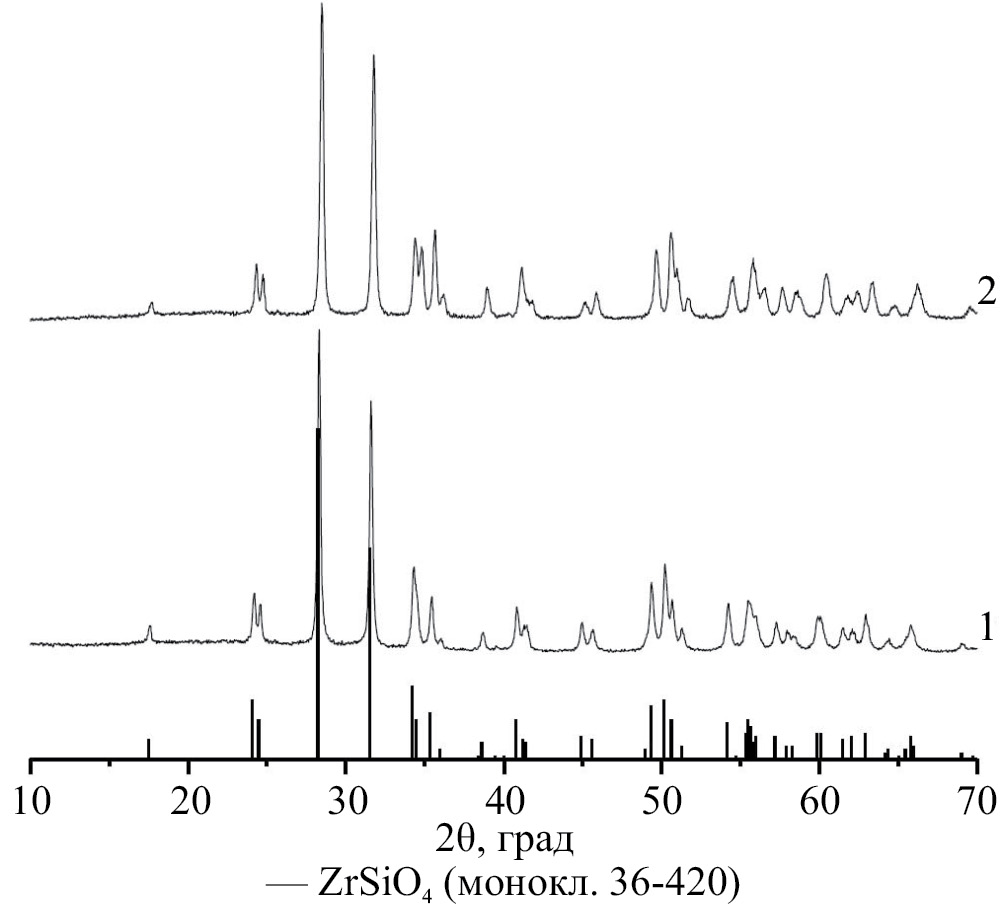 Рис. 7. Рентгеновские дифрактограммы ZrO2 (1) и HfO2 (2) после обжига при 1300°C (24 ч), и штрих диаграмма ZrO2 из базы данных ICDD-PDF 2 2022