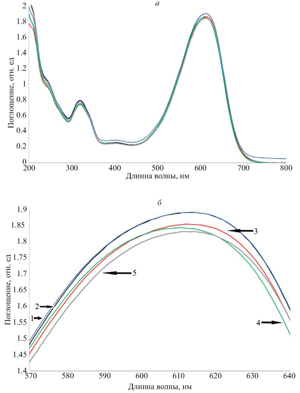 На рис. 2 а, б представлены спектры оптической плотности растворов красителя CSB во всем исследованном спектральном диапазоне 200–800 нм (рис. 2 а) и в диапазоне (570–640 нм) (рис. 2 б): исходного раствора красителя до УФ облучения (рис. 2 б, спектр 1) и после облучения (рис. 2 б, спектр 2); а также растворов красителя после УФ облучения, контактировавших с пустым пористым стеклом толщиной 1.5 мм (рис. 2 б, спектр 3), с композитом «ПС–ZnO» на основе ПС-матрицы толщиной 1.0 мм (рис. 2 б, спектр 4) и толщиной 1.5 мм (рис. 2 б, спектр 5).