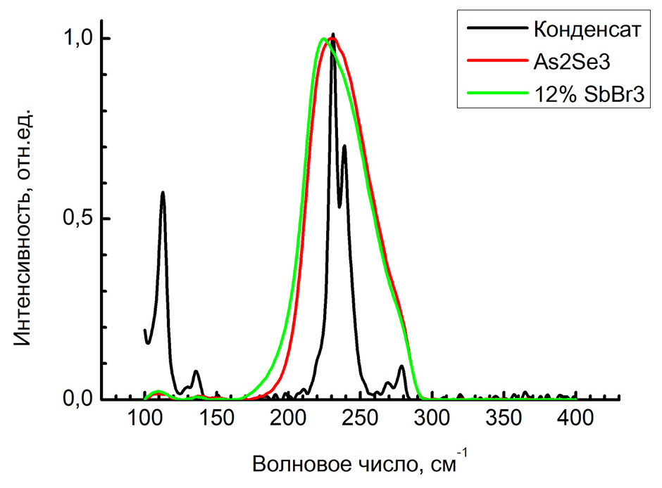 Структуру стекол можно описать как раствор молекулярных группировок SbBr3 в сетке стекла, построенной из тригональных структурных единиц AsSe3/2 и цепочечных SeSe2/2. Возможность протекания реакции обмена между As2Se3 и SbBr3 контролировалась с помощью спектроскопии комбинационного рассеяния. На рис. 6 приведены КР спектры исходного селенида мышьяка и стекла, содержащего 12 мол. % бромида сурьмы. Видно, что при введении бромида сурьмы наблюдается лишь незначительный сдвиг максимума основной полосы селенида мышьяка с 231 до 224 см-1.