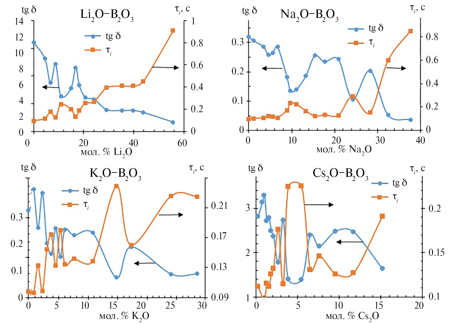 Рис. 3. Зависимости тангенса угла механических потерь и времени релаксации от состава расплава x Me2O–B2O3 (Me = Li, Na, K, Cs).