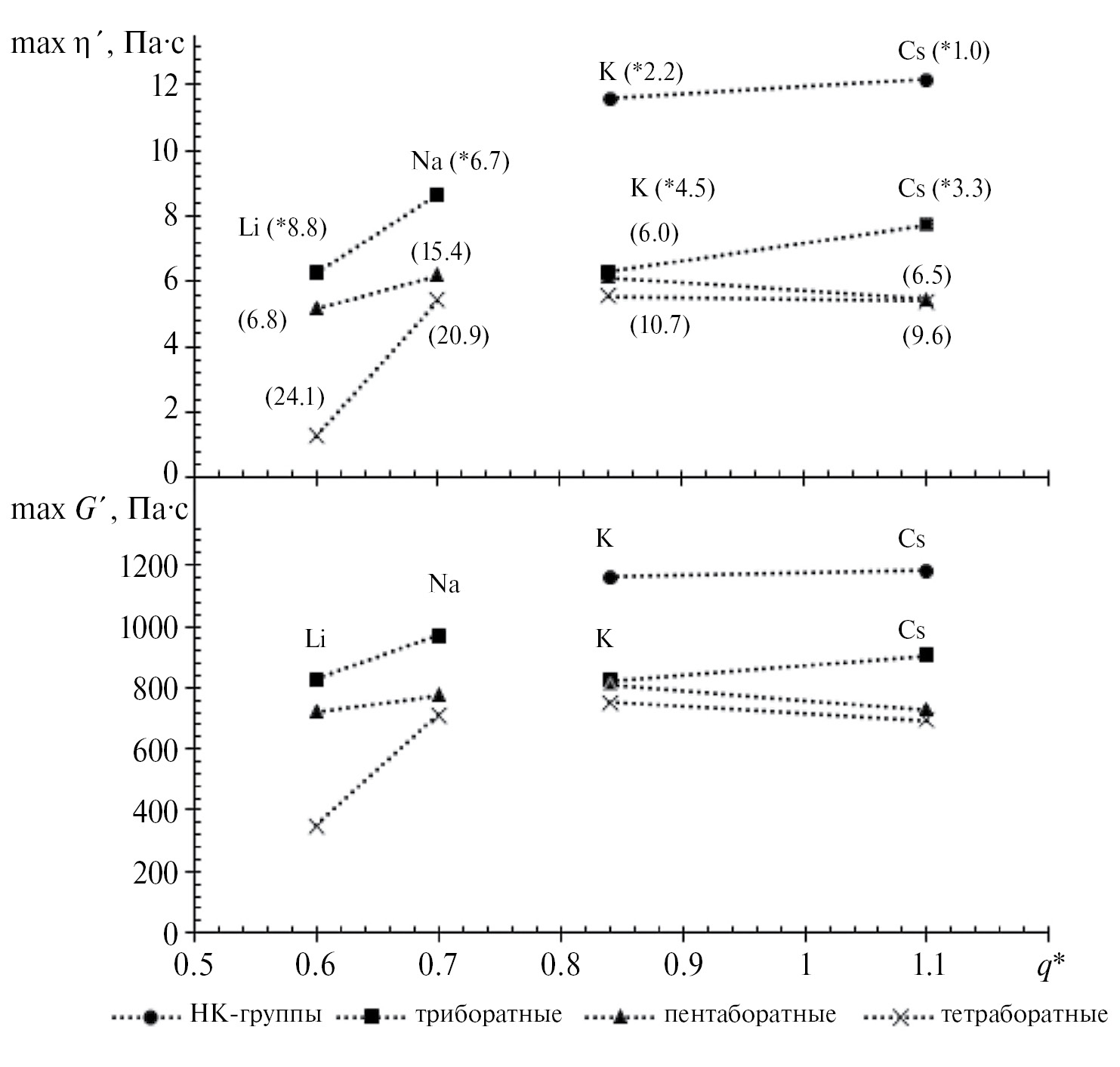 С целью более детальной оценки влияния природы щелочного металла на свойства боратных расплавов удобно рассмотреть зависимость только экстремальных значений вязкоупругих характеристик от координационных чисел катионов и их эффективных зарядов (q*). Эффективный заряд катиона определяет степень ионности связей Me–O, его значения получены на основе данных интегральных полос ИК-спектров щелочноборатных систем [28] и приведены в табл. 3.