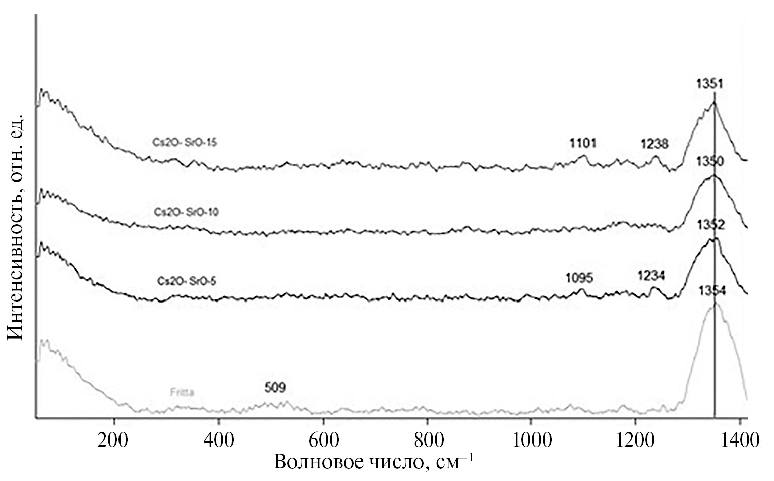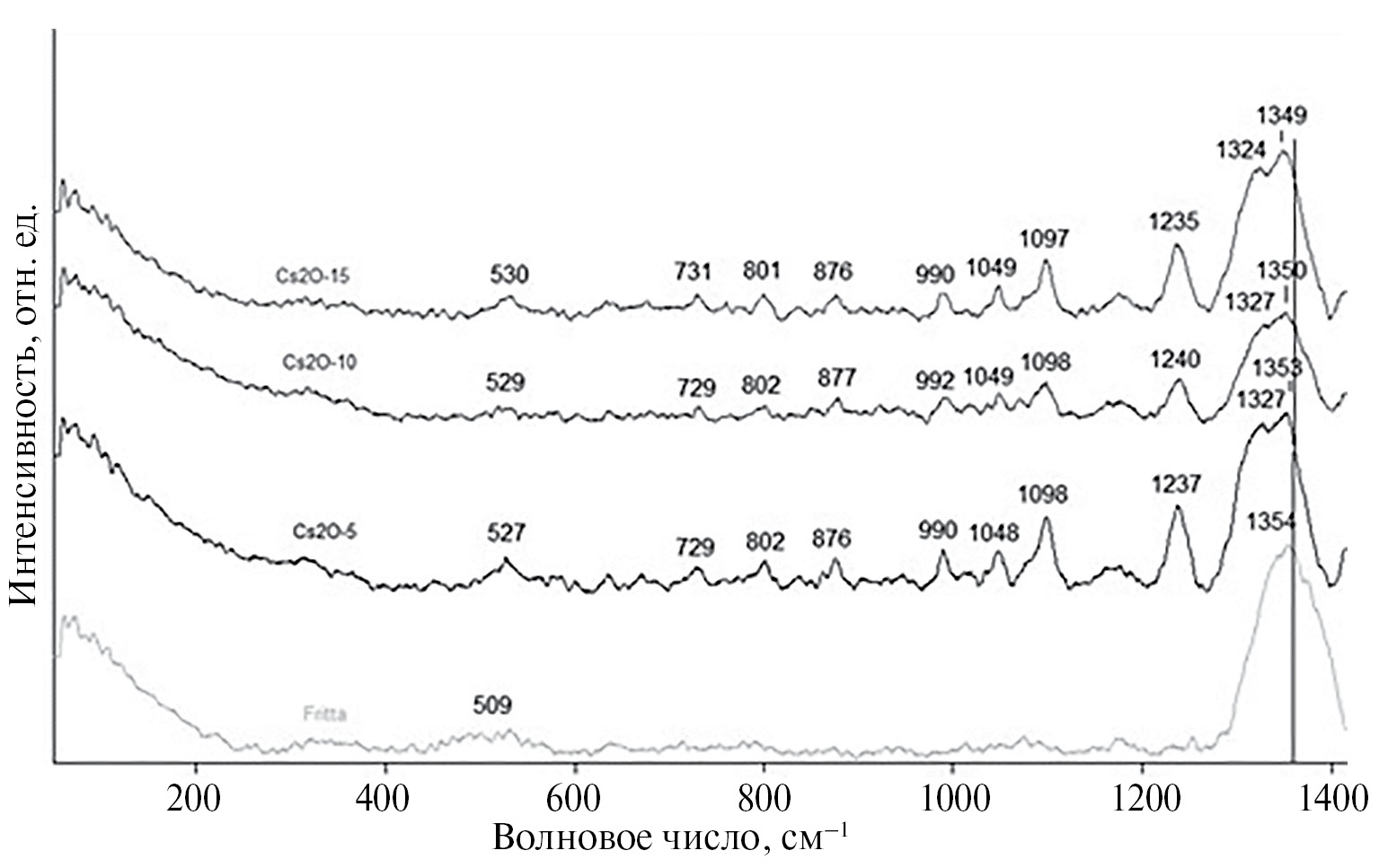 В образцах с содержанием Sr соотношение R2O/B2O3 ≈ 0.8, с суммой Cs и Sr это соотношение составило от 1 до 1.5, в образцах цезиевых стекол R2O/B2O3 – от 1.2 (5 мас. % Сs) до 1.9 (15 мас. % Сs). По-видимому, избыток щелочных оксидов в образцах цезиевых стекол вызывает изменения структуры – увеличение бора в тройной координации, присутствие немостиковых атомов кислорода, что подтверждается на КР-спектрах при смещении линии 1350 см–1 в область низких частот и наличии линий 1050, 990, 876, 802 см–1, что может свидетельствовать о частичной деполимеризации сетки стекла.