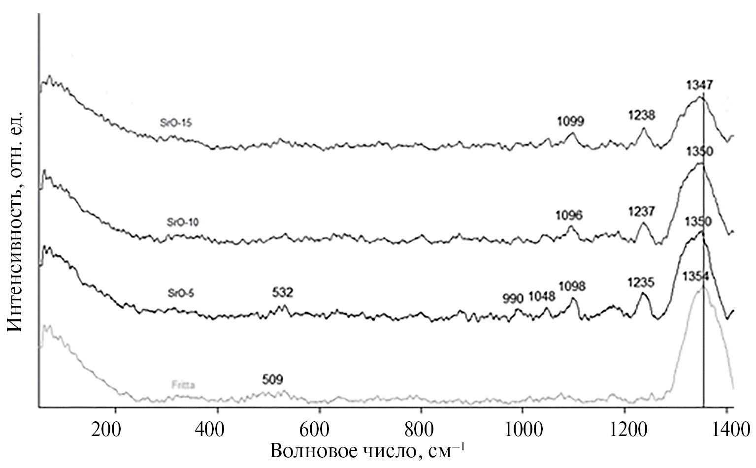 В образцах стекла со стронцием полос, отвечающих таким эффектам, на КР-спектрах не наблюдалось, что может указывать на положительную роль иона Sr2+ на стабильность стекла, который, подобно иону Са2+ [19], одновременно повышает его химическую стойкость.