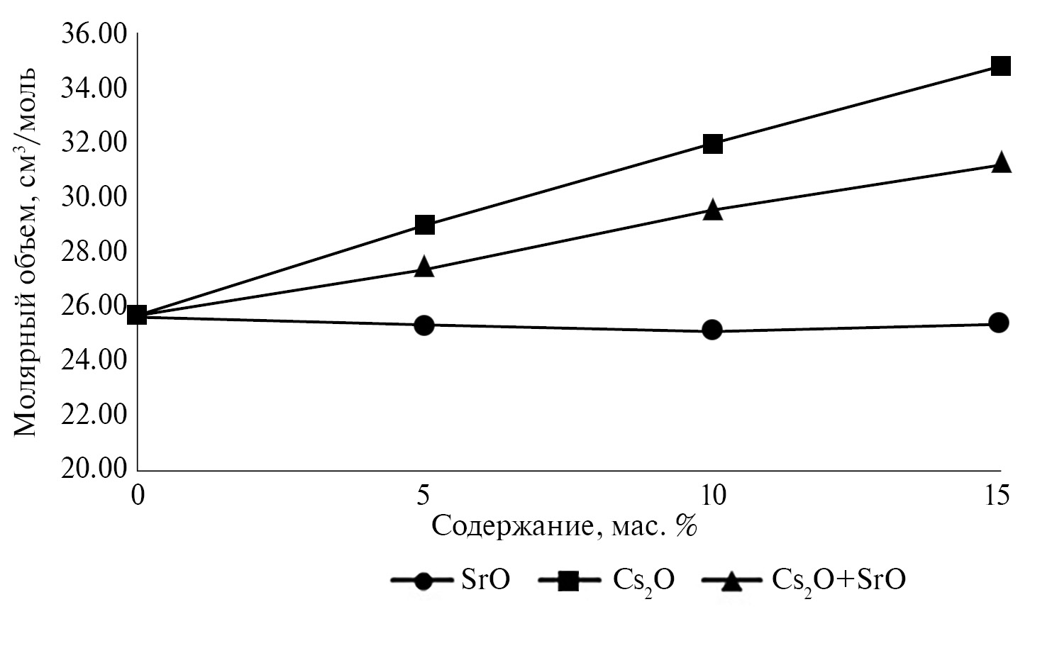 При включении SrO молярный объем не изменялся, тогда как при включении суммы Cs2O и SrO (особенно Cs2O) происходило его значительное увеличение.