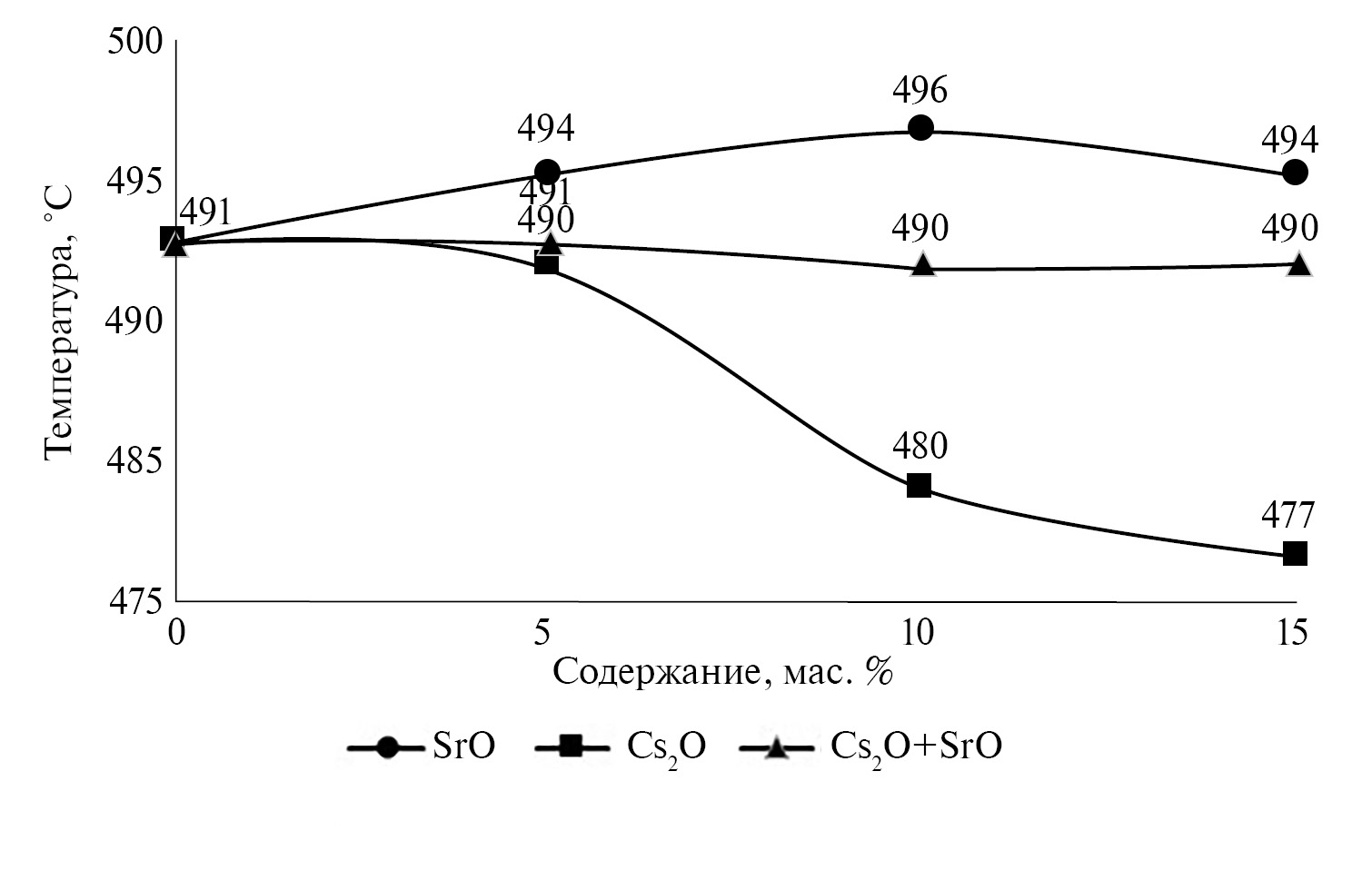 На рис. 5 приведены данные Тg исходной фритты и стекол, содержащих Cs2O и/или SrO. Анализ полученных данных показал, что добавка Sr и суммы оксидов Cs и Sr практически не изменяет температуру стеклования. Добавление оксида Cs до 15 мас. % уменьшает Тg до 477 °С.