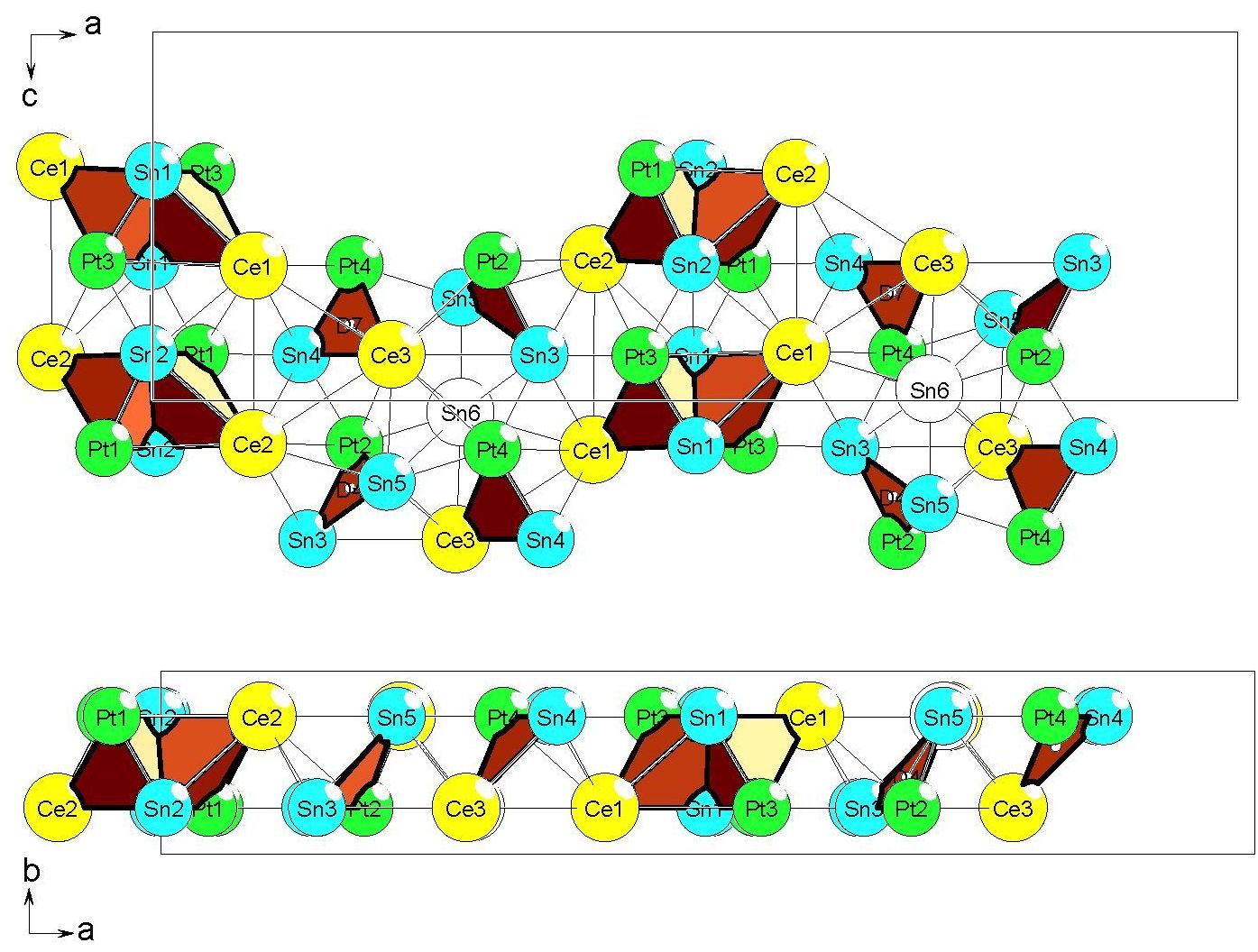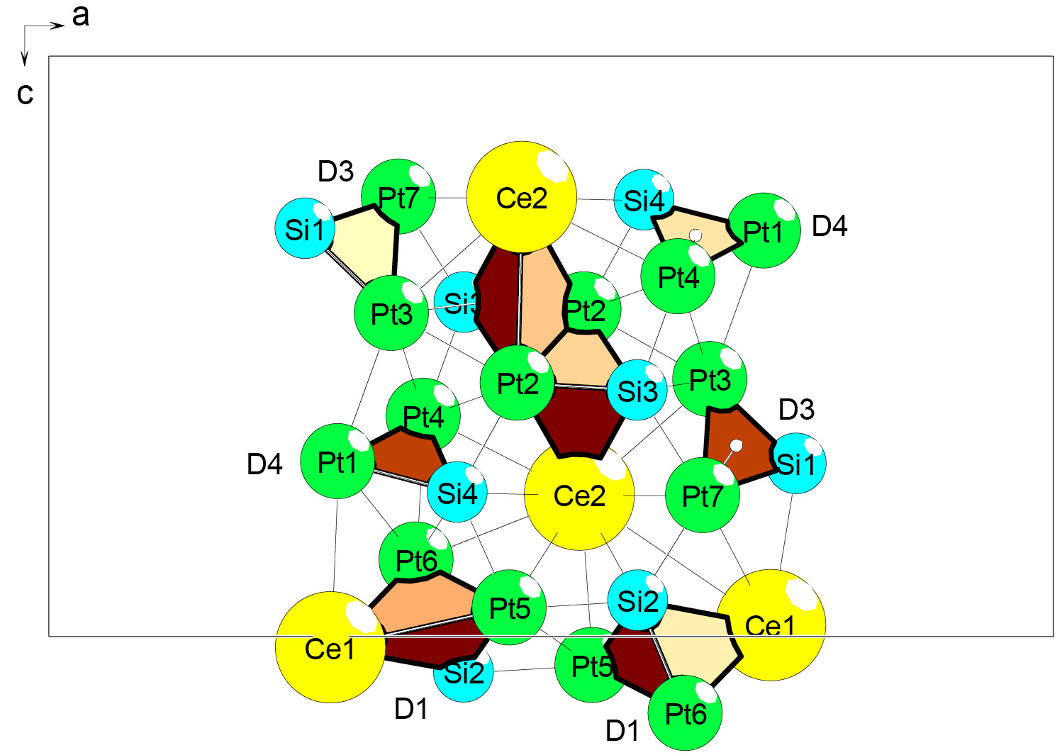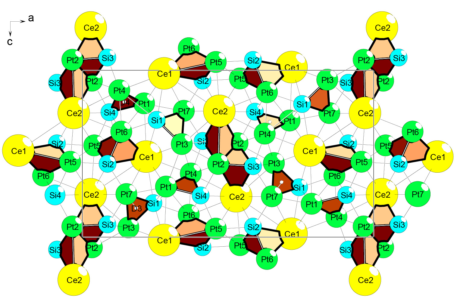 Тройные соединения Ce2Pt7Ge4-oP52 [9] и Ce2Pt7Si4-oP52 [10] образуют кристаллохимическое семейство. Последовательность Вайкоффа имеет вид c13, соответственно, по 26 атомов в элементарной ячейке находятся в плоскостях m. Тип каркас-образующих кластеров-прекурсоров, образующих упаковки для Ce2Pt7Si4-oP52 и Ce2Pt7Ge4-oP52, не известен.