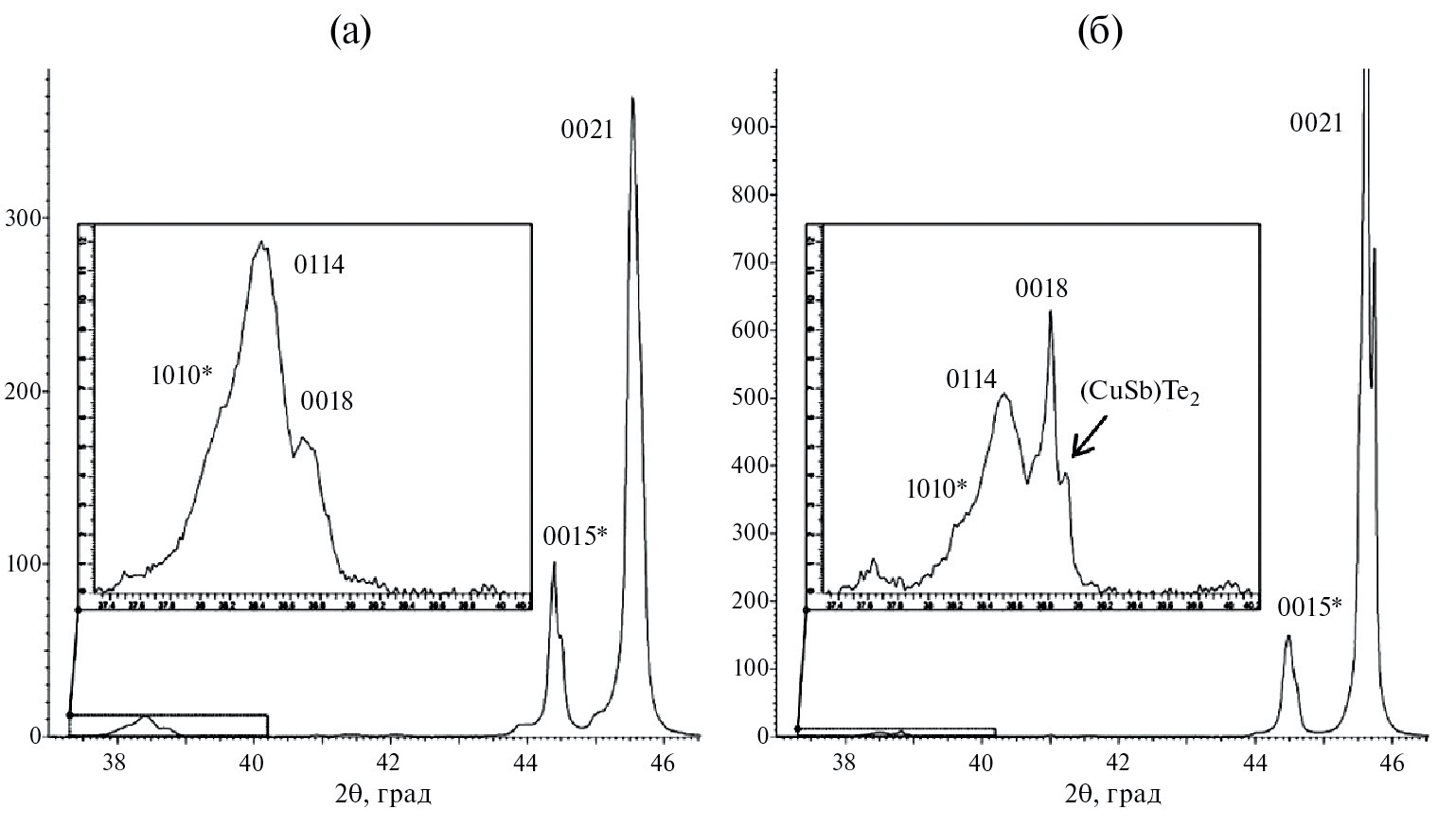 Наличие широкого диффузного рефлекса в диапазоне 2θ = 37–39° может быть связано с тем, что в присутствии атомов меди происходит образование сложной фазы типа Pb2Sb6Te11, не определяемой в нелегированных слитках.