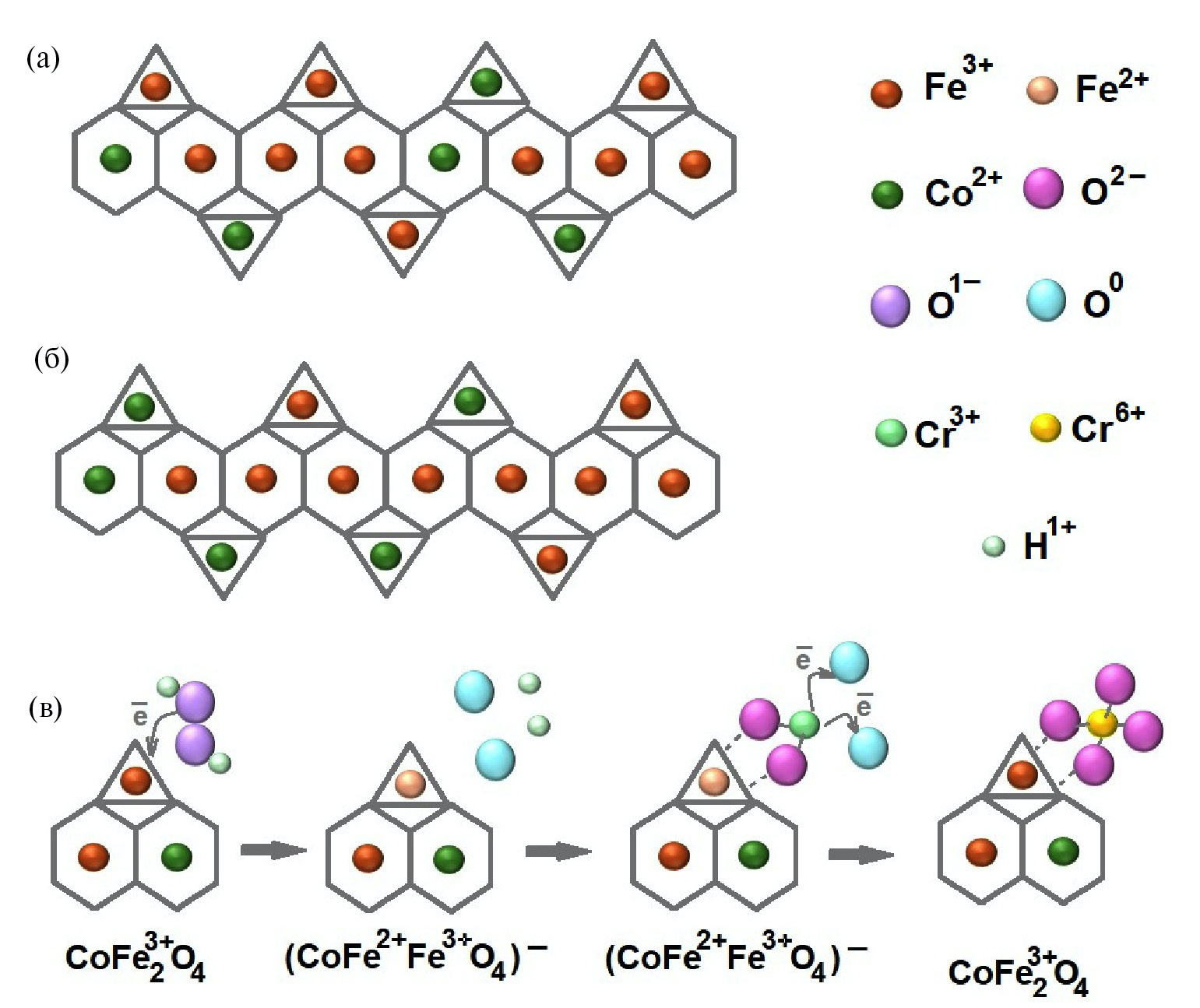 Рис. 4. Схематическое изображение распределения катионов по узлам решетки шпинели (а, б) в феррите кобальта и Фентон-подобного процесса (в).